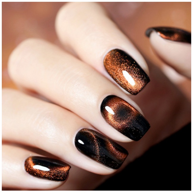 Грядет год тигра, поэтому вы наверняка задумывались, что без анималистического принта тут не обойтись. Мы предлагаем немного сместить этот вектор и выполнить маникюр в стиле «тигрового глаза». Янтарная текстура и насыщенные переливающиеся оттенки выглядят просто роскошно. Если вы любите соблюдать каноны восточного календаря — это замечательная альтернатива банальных дизайнов.