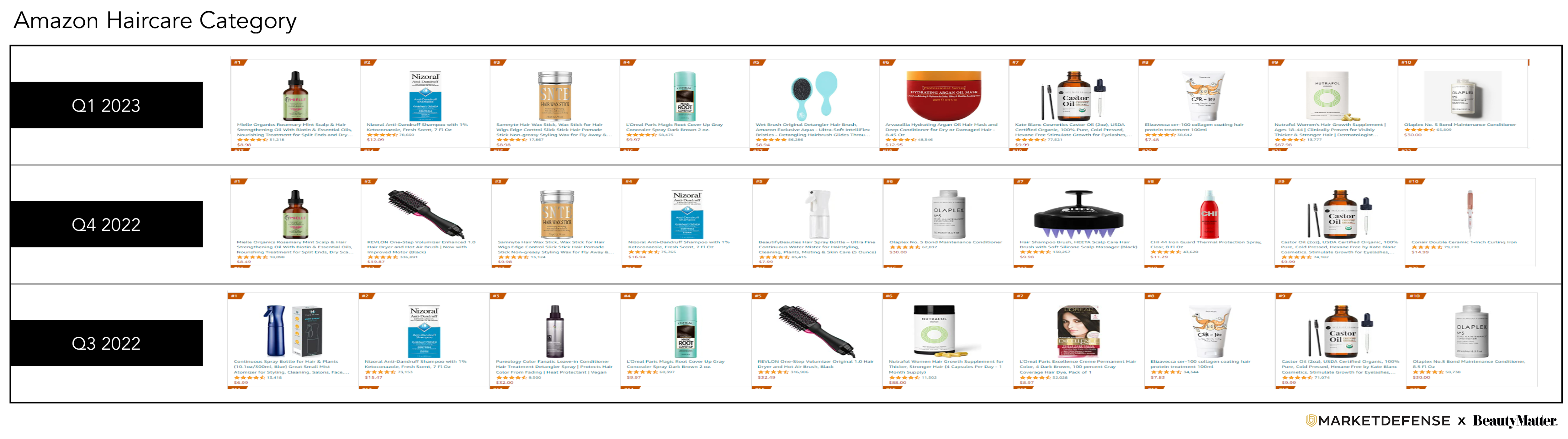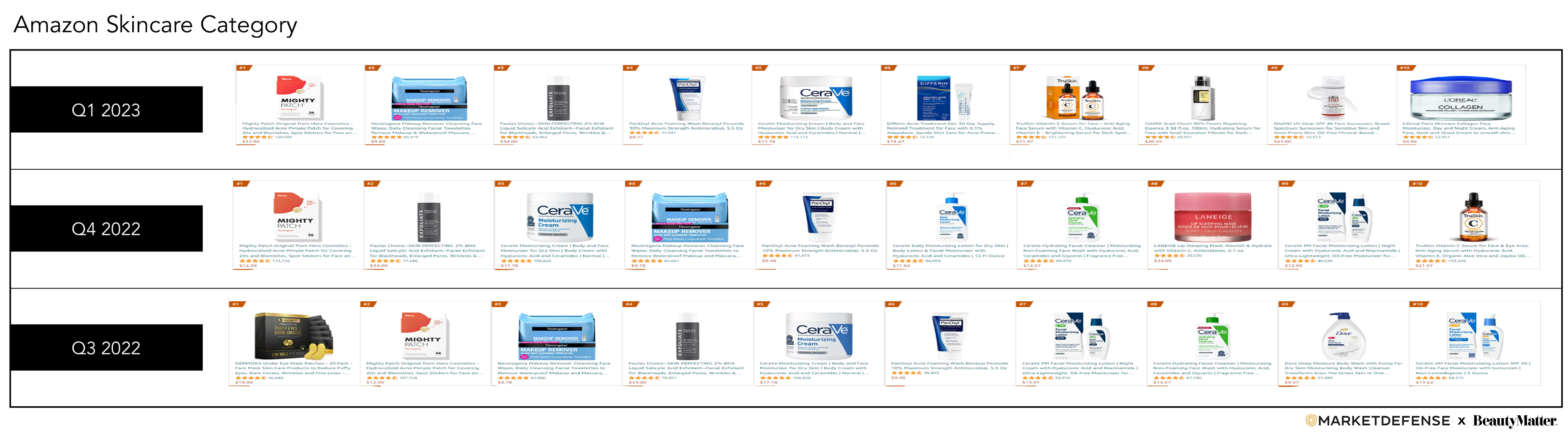 In a shift from previous quarters, the top 10 skincare products on Amazon during Q1 2023 began to shift away from the usual mass market brands (like CeraVe, which represented 40% of the category last quarter) in favor of more prestige brands like TruSkin, COSRX, and Elta MD, alongside Paula’s Choice, which has been on the list for the last several quarters. Top 10 staples from Neutrogena, PanOxyl, and Hero Cosmetics rounded out the skincare top 10 during Q1.