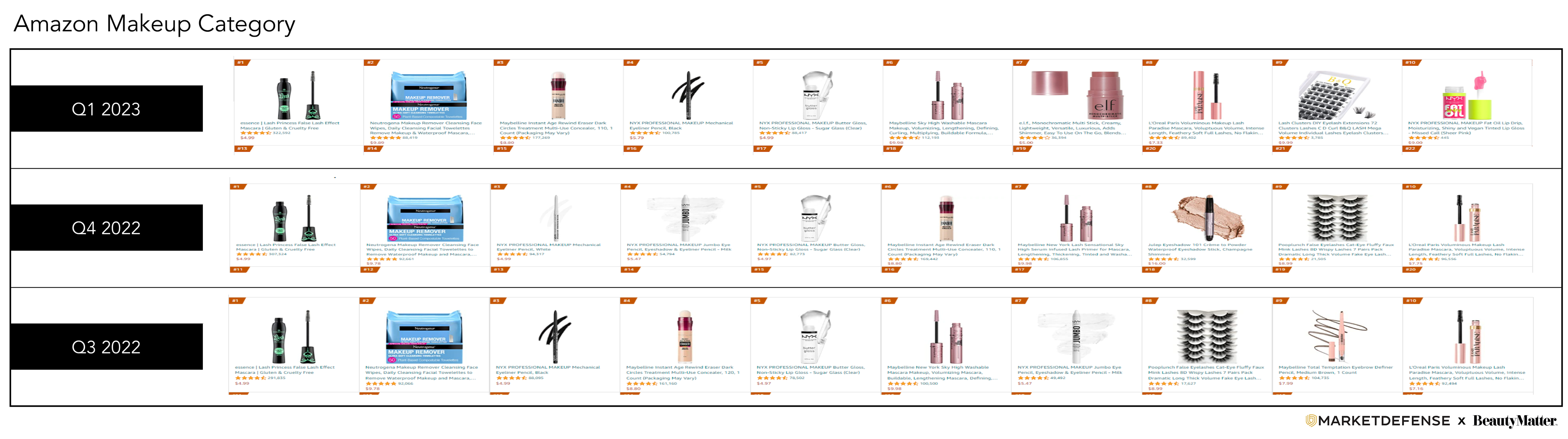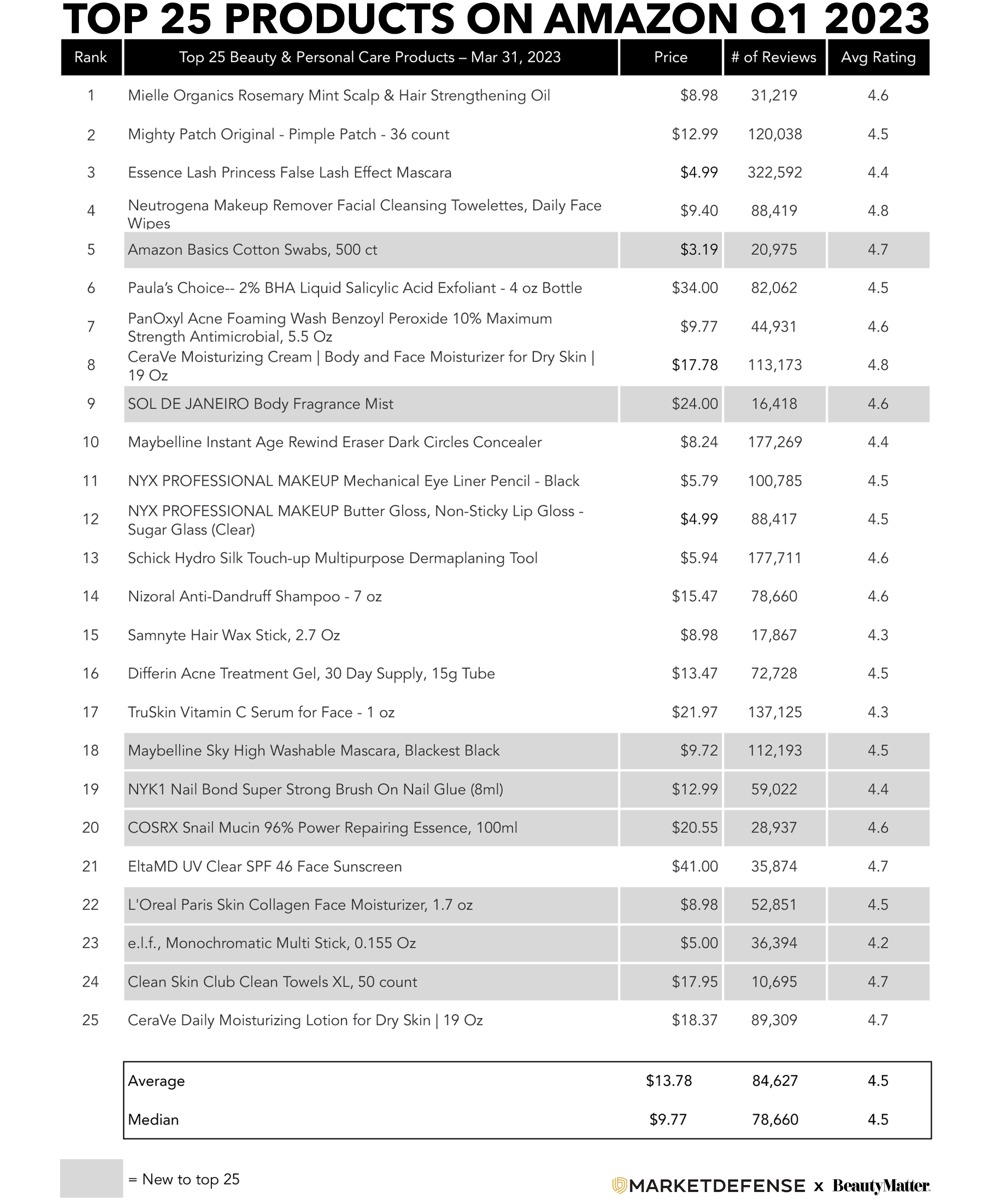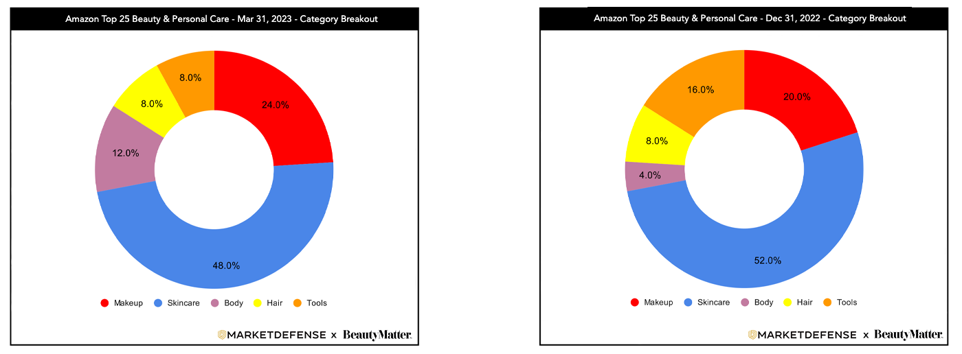 In terms of the beauty categories that comprised the Top 25 List in Q1, Amazon customers shifted some of their spending versus 2022. Skincare products represented the lion’s share of the Top 25 List, representing 48%, a four-percentage point decline from last quarter. Makeup picked up all of that volume, with a four-percentage point increase versus last quarter to 24%. Body increased eight-percentage points to 12% at the expense of tools, which declined eight-percentage points to just 8% of the Top 25 List. Hair held steady at 8%.