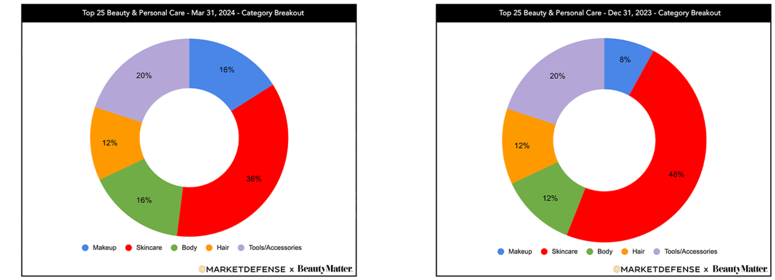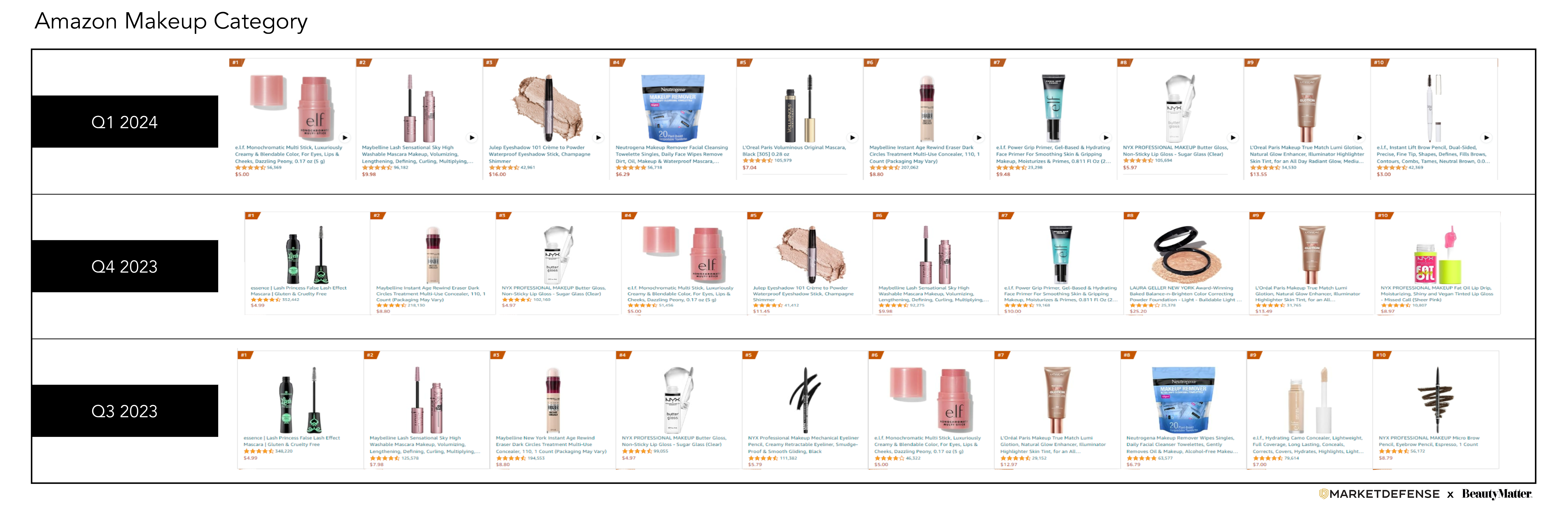 e.l.f. Cosmetics had three products in the Makeup Top 10 this quarter. The rest of the list was full of mass favorites from Maybelline, L’Oréal, and NYX. The average price point of the Makeup Top 10 was $8.51, down 17.3% from last quarter’s average of $10.29.