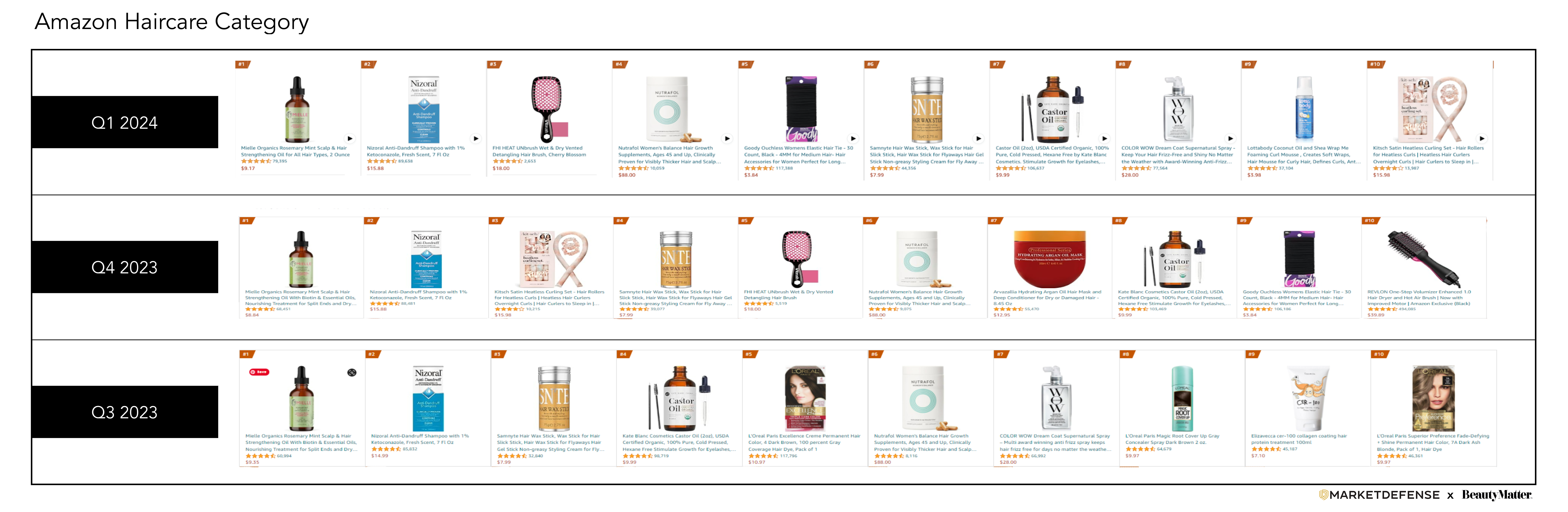 The Haircare Top 10 continued to be led by Mielle’s Rosemary Mint Scalp & Hair Strengthening Oil and Nizoral Anti-Dandruff Shampoo. Nutrafol’s Women’s Balance Hair Growth Supplements moved up two spots from last quarter, from number six to number four. Nutrafol’s movement up the list stands out because of its price point of $88.00, well above the Haircare Top 10 average of $20.08, or $12.53, excluding Nutrafol.