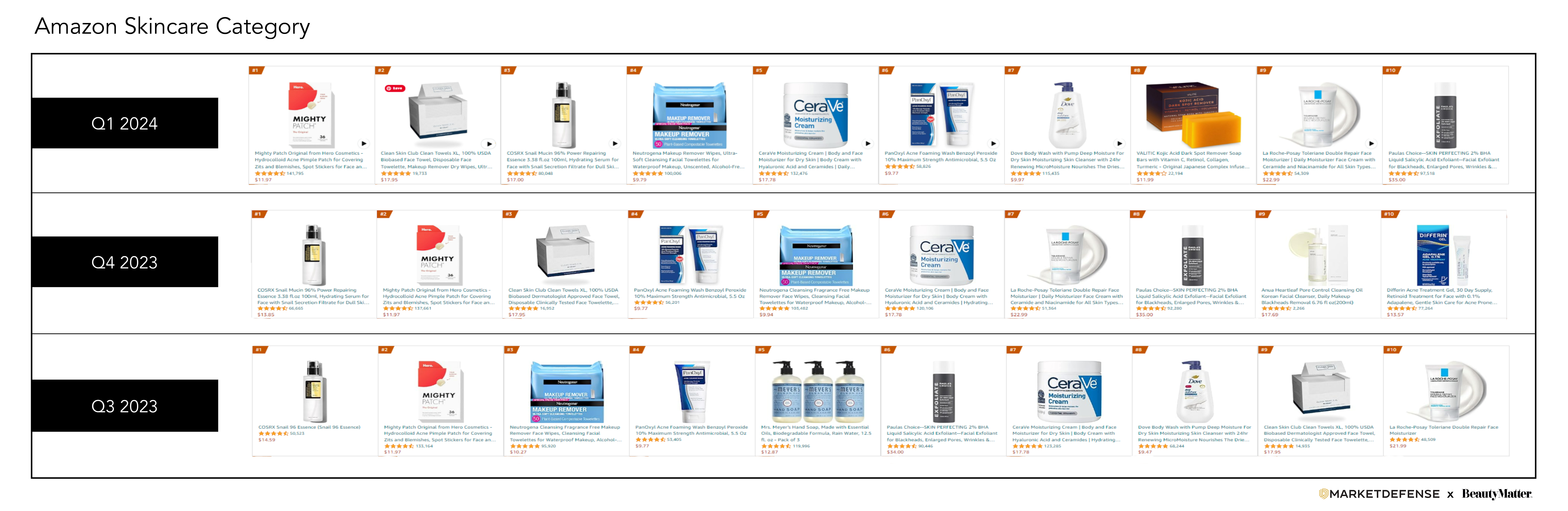 Mass brands like Mighty Patch, COSRX, PanOxyl, Neutrogena, and CeraVe made up the majority of the Skincare Top 10 in Q1. VALITIC Kojic Acid Dark Spot Remover Soap Bars joined the top 10 this quarter for the first time ever. The average price point of the Skincare Top 10 was $16.42.