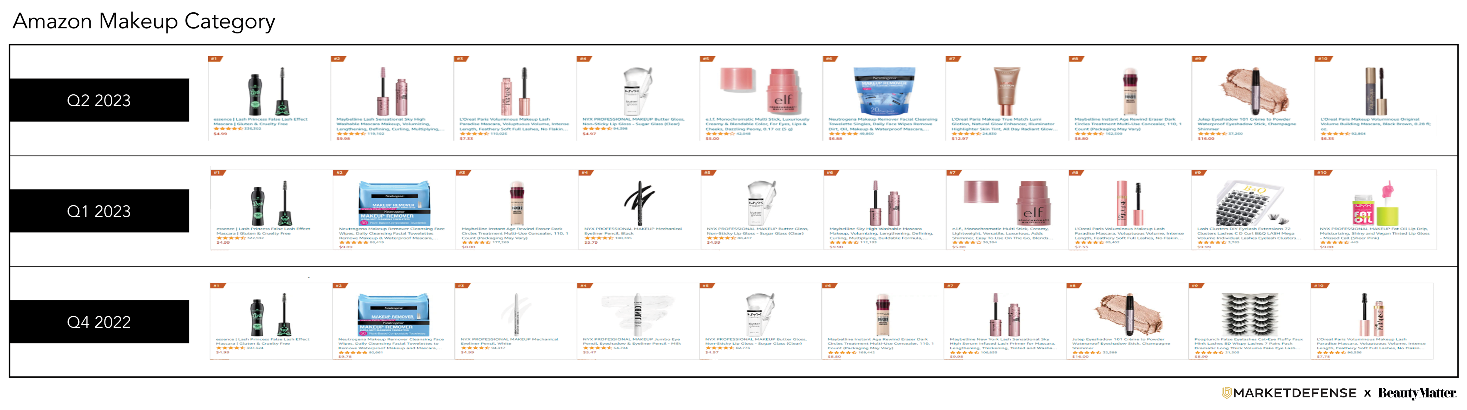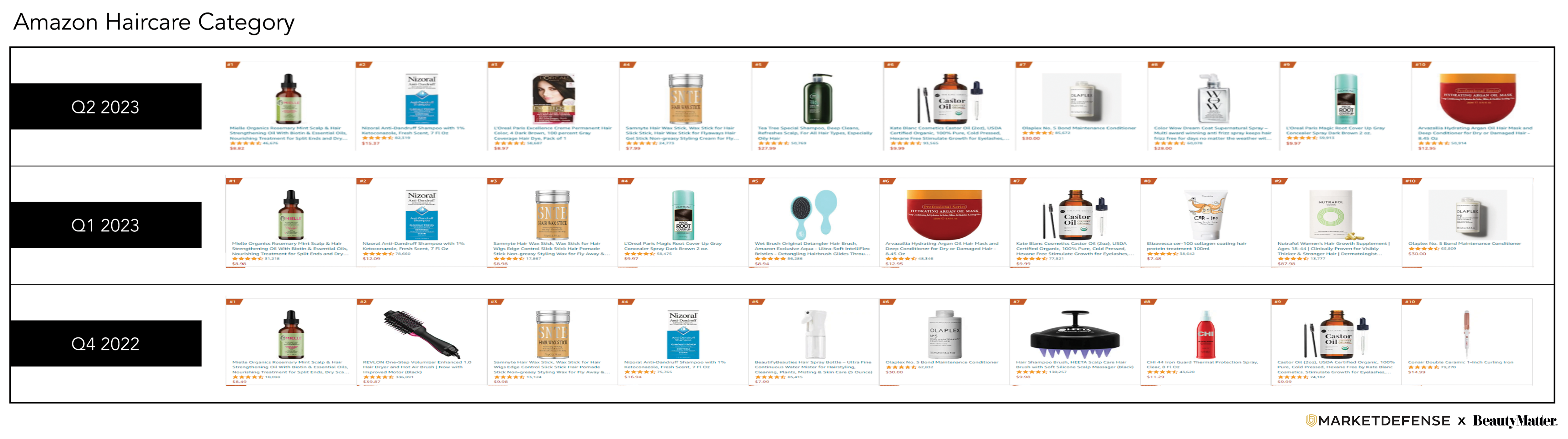 Last quarter, CosRX Snail Mucin Essence debuted on the Top 25 List #20. This quarter, after over 375 million views of #snailmucin on TikTok, they’ve jumped to the #2 spot, displacing perennial favorite Mighty Patch Original Pimple Patches, which has held the spot for much of the past two years. In Q2, Mighty Patch fell to an unprecedented #10, the lowest ranking for the product since we started reporting on the Top 25 List two and a half years ago. This might have something to do with increased competition in the market for hydrocolloid blemish solution products and Mighty Patch’s retail expansion at the likes of Target and Ulta. Regaining its #1 spot for the first time since Q2 of last year, Essence Lash Princess False Lash Effect Mascara displaced Mielle Rosemary Mint Scalp & Hair Strengthening Oil. Mielle took Amazon beauty by storm in Q4 of 2022 with its debut on the Top 25 List in the #1 spot after an appearance on TikTok influencer Alix Earle’s list of top 2022 Amazon purchases. The product maintained its #1 spot last quarter as the press regarding the brand’s acquisition by Procter & Gamble helped it maintain momentum. In Q2, Mielle remains one of the top beauty brands on Amazon, coming in at #3.