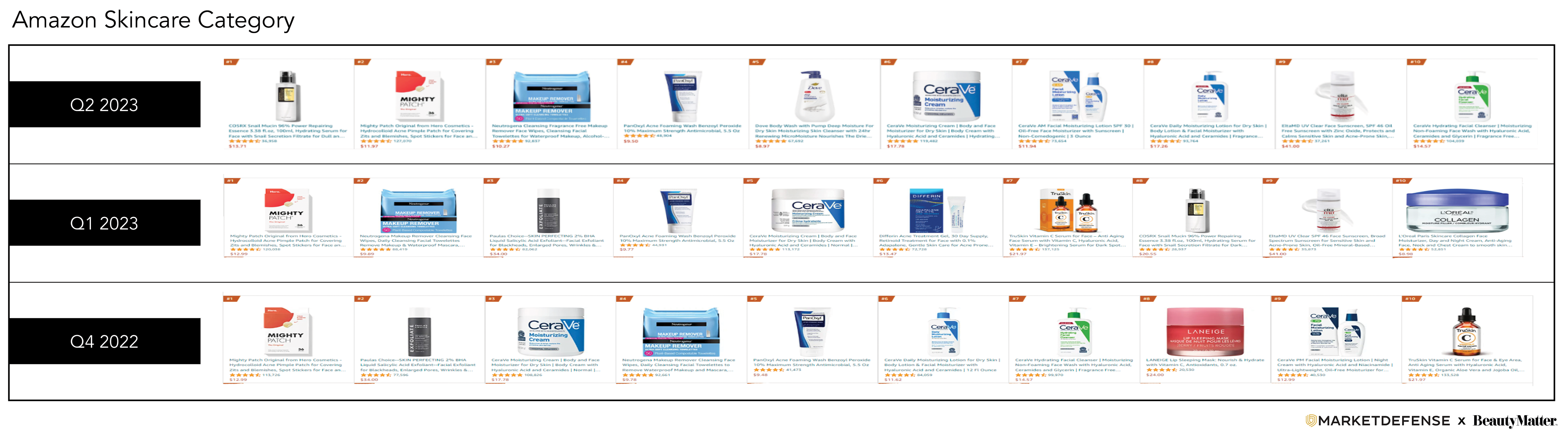 Consistent with the trend toward price-inclusive beauty on Amazon, the top 10 skincare products on Amazon during Q2 largely consisted of mass favorites like CeraVe, comprising 40% of the list, Dove, PanOxyl, and Neutrogena. EltaMD UV Clear Face Sunscreen was the only truly prestige product on the Skincare Top 10 this quarter.