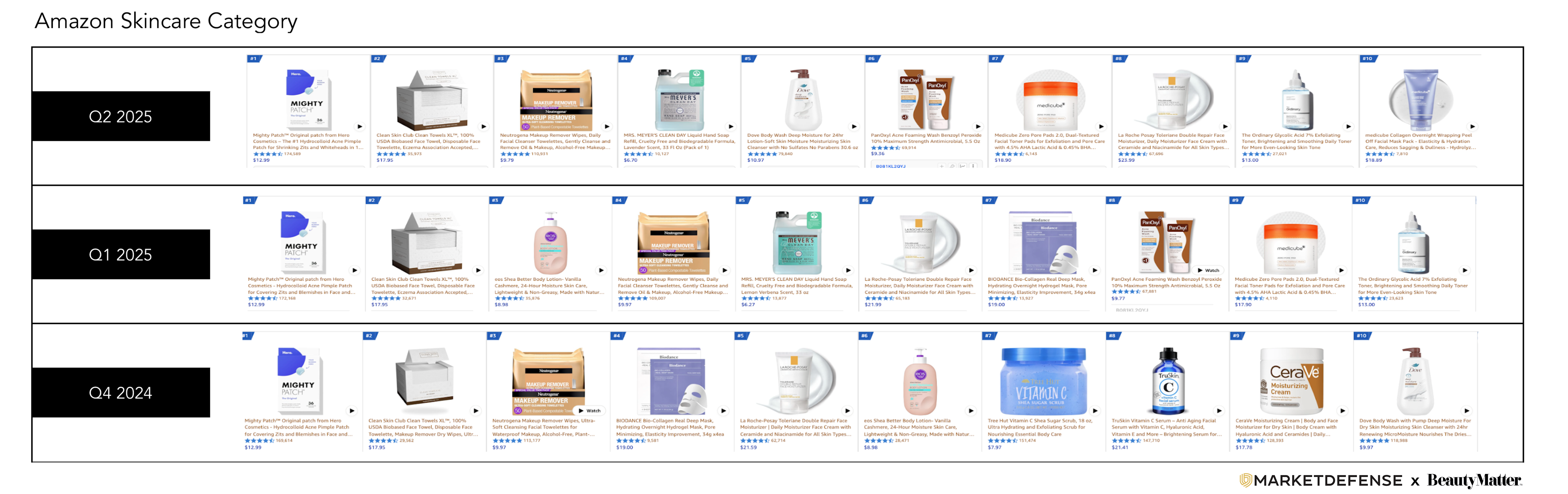 But as with all trends, smart strategy matters. Chasing hype can feel like a sprint, but the wins come to brands that think like marathoners. Just look at pimple patches—once a niche term, now a category staple. Amazon searches for “pimple patches” are flat YoY but still total well over 500,000 a month. Hero Cosmetics Mighty Patch remains the #1 product in the Top 25, holding that position since Q4 2023. Hero turned a trend they helped ignite into lasting category dominance—proof that early investment and consistent execution can build enduring market leadership.