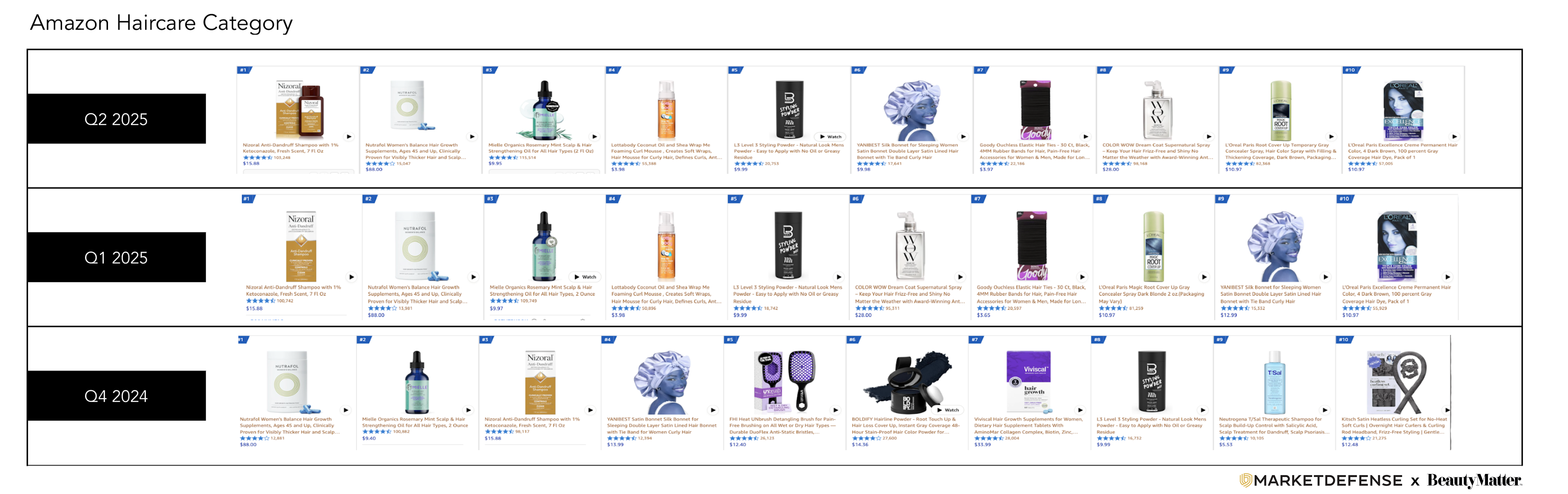 The exit of Nutrafol Women’s Balance Hair Growth Supplements from the Top 25 contributed significantly to the drop in average price. At $88, it had been one of the highest-priced items on the list and a consistent driver of the $15+ average over the past four quarters. Who knows if it will make it back to the Top 25 next quarter, but hair growth is not going anywhere on Amazon. It still accounts for the majority of Haircare category sales, and related searches total over 1.1 million per month, though volumes are flat to last year. Interestingly, more specific terms like “hair loss red light therapy” (+234%) and “hair loss therapy” (+807%) are seeing steep increases—evidence that consumers are becoming more savvy about solutions beyond supplements and oils. Overall, red light continues to shine bright, with searches up 34% year over year (YoY), now approaching 900K per month.