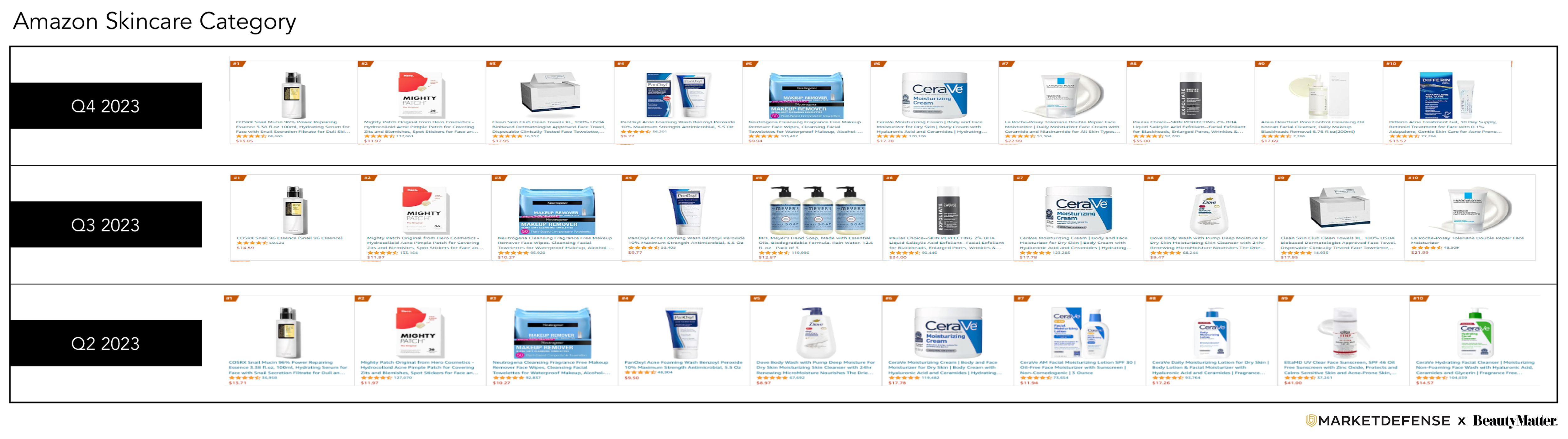 Mass and masstige brands like COSRX, Mighty Patch, PanOxyl, Neutrogena, and CeraVe made up the majority of the Skincare Top 10 in Q4. Anua’s Heartleaf Pore Control Cleansing Oil joined the top 10 this quarter for the first time ever. The average price point of the skincare top 10 was $17.01.