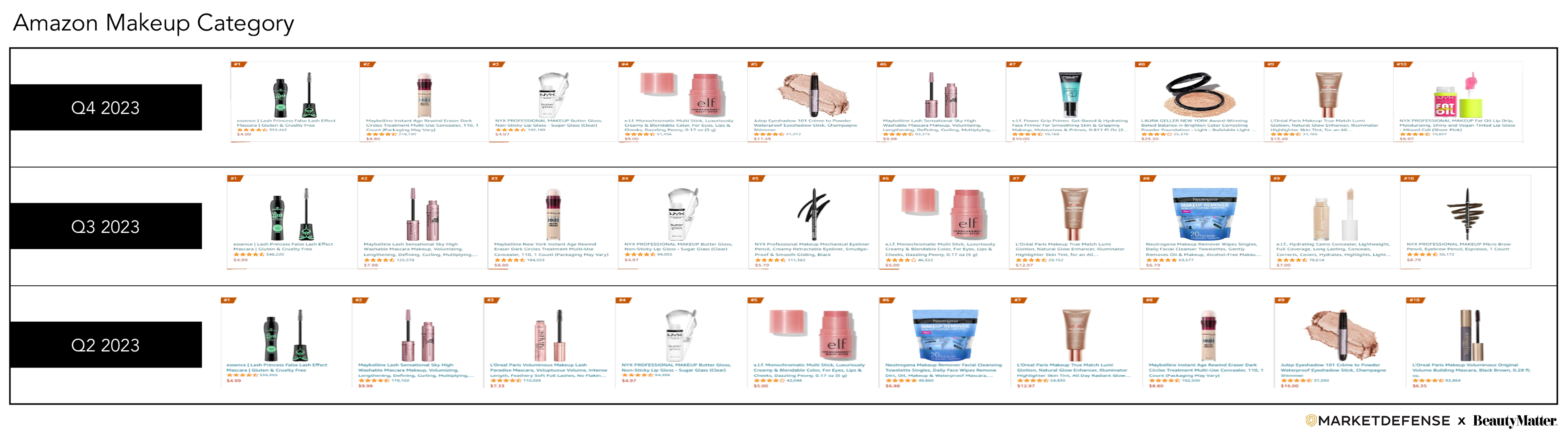 The Makeup Top 10 was consistent with previous quarters, highlighting favorites from Essence, Maybelline, NYX, and e.l.f. Top 10 newcomer, Laura Geller New York Award-Winning Baked Balance-n-Brighten Color Correcting Powder Foundation, helped drive the average price point of the Makeup Top 10 to $10.29, from $7.31 last quarter.