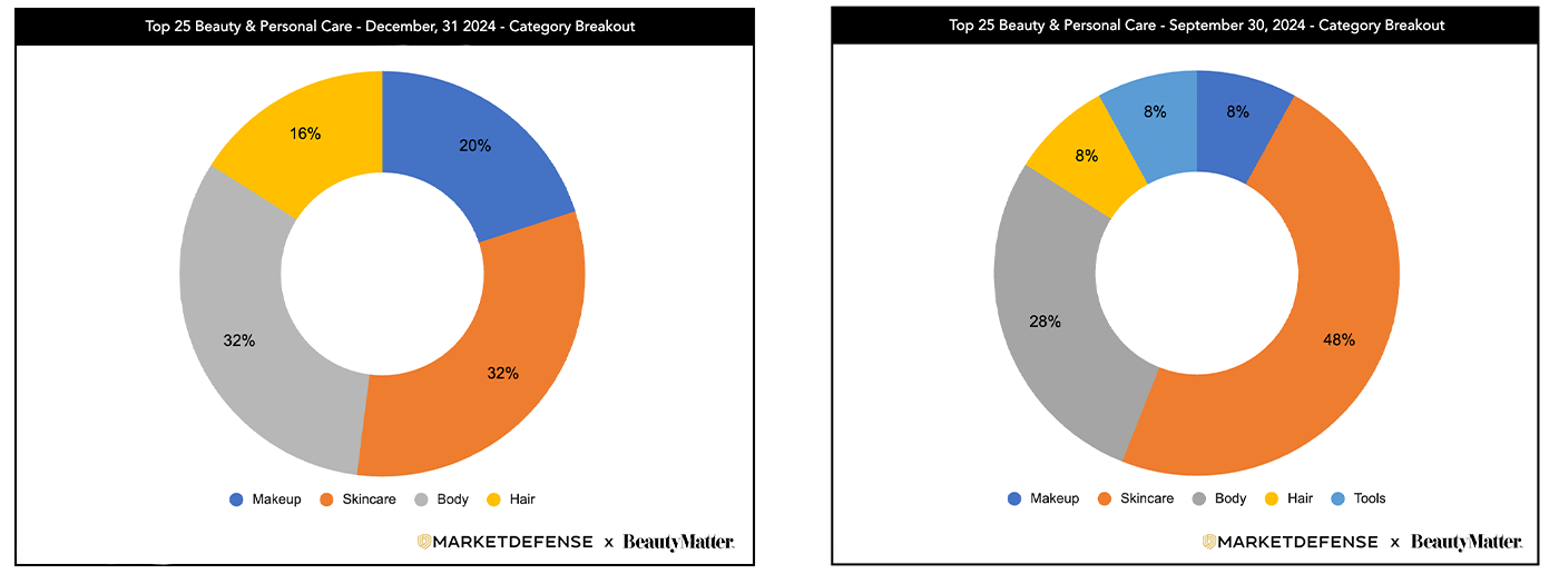The skincare and body categories continued to dominate the top 25, with the two combined making up 64% of the list. The skincare category ceded some share to makeup and hair, which both saw an increase versus Q3. Interestingly, there were no tools represented in the top 25 in Q4. The average price point of the products on the top 25 list increased 4% from Q3 to $15.33.