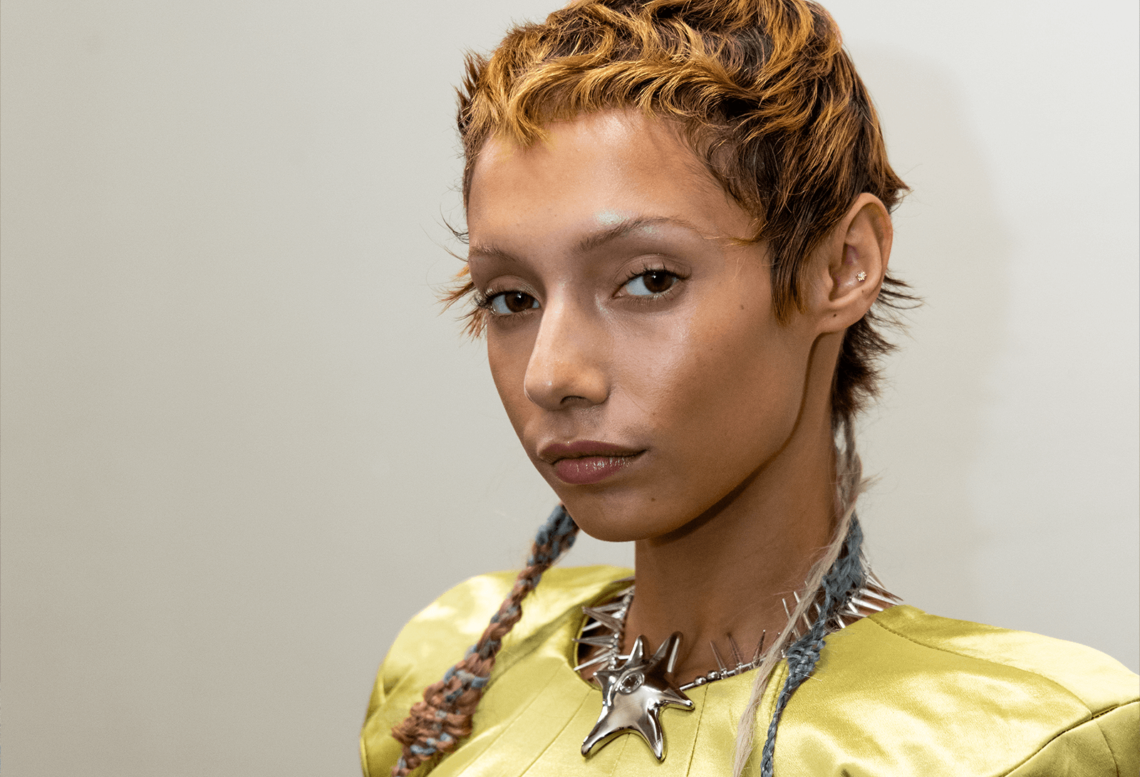 "Today is an evolution of the looks we've created together from previous seasons, continuing with a grungy yet organic style, with a touch of refinement to give us a controlled-chaos look—speaking to the theme Soft I s Hard. We integrated razored Collina Strada fabrics into hair to give a combined voice of Collina Strada, Evanie, and Bumble and Bumble," added Frausto.