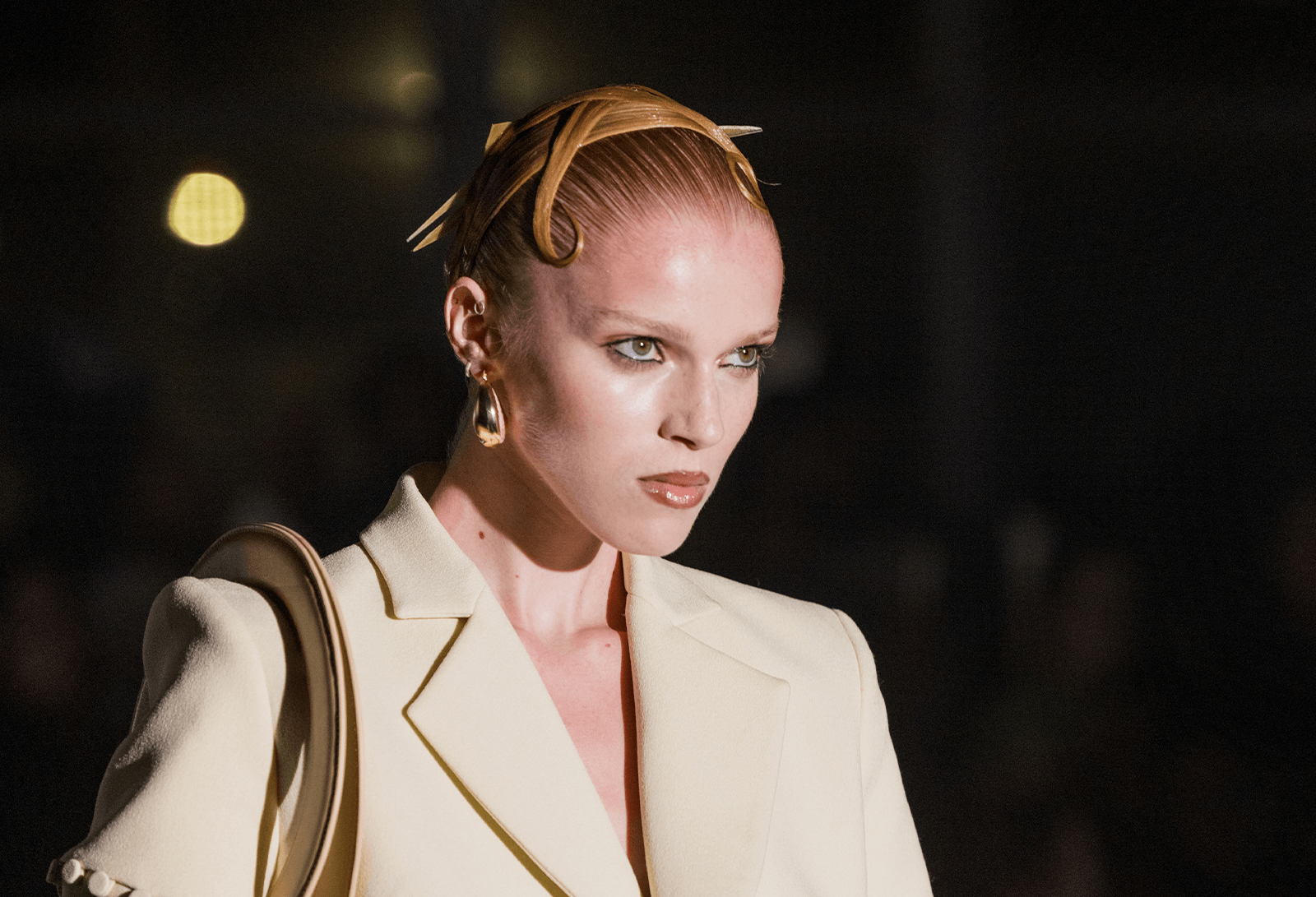 "We are bringing an extreme modern edge by doing a 2020s take on 1920s," Frausto told BeautyMatter. "This modern wet set is pulled back and sculpted—our hairstyles for this show have a duality, showing sharpness with hair spikes together with curvature in perfect circles."