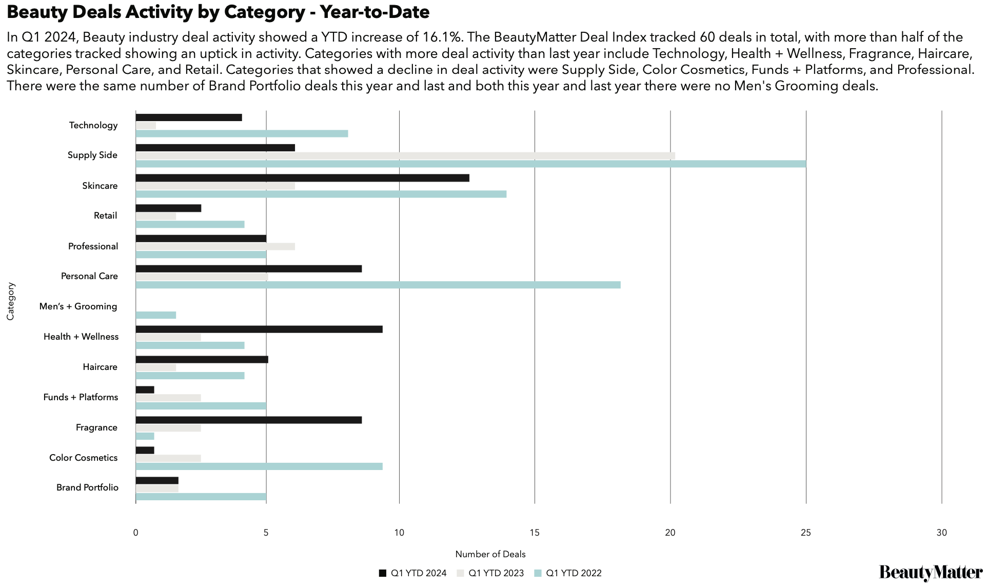For the first quarter of 2024, the BeautyMatter Deal Index tracked 65 deals, a 16.1% increase in transactions from the first quarter of 2023. The Index also tracked seven brand failures, a combination of bankruptcies and brand shutdowns during the quarter, which was consistent with the quarterly failures tracked in the back half of 2023. After a unique shift away from growth investments and toward M&A activity seen in Q4 2023, deal activity in Q1 2024 returned to a more even split between growth investments and M&A, a good sign that investors continue to believe in the long-term fundamentals of the beauty and wellness industries.