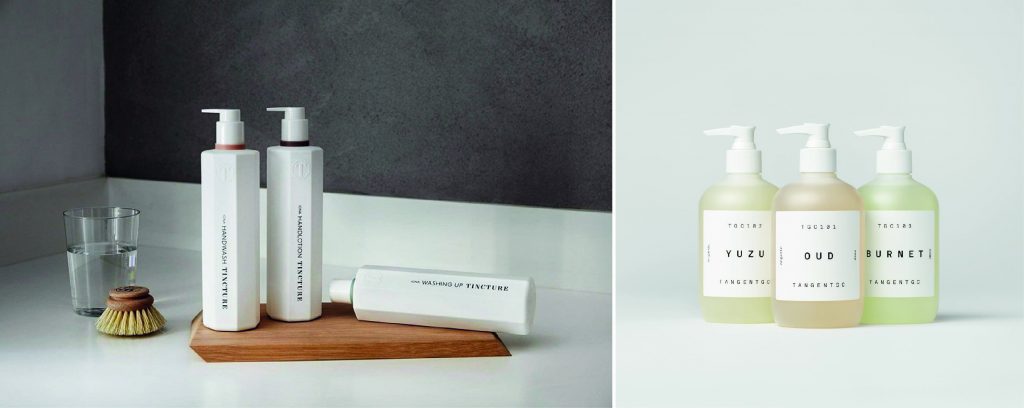 Almost indistinguishable from contemporary fragrance bottles is the Berlin-based L’EAUNDRY range of fabric washes, made in collaboration with top perfumers “to enhance everyday life, from our skin to our clothes to our home.” They have even taken the now classic route of beauty Limited Edition sets with a collaboration with floral stylists Mary Lennox, that combines miniature bottles with limited-edition postcards and packaging. Tom Dixon, the legendary interior and product designer, has extended his ultra-modern luxe aesthetic of copper, white, and black into a range of dish- and hand-washing and care products.