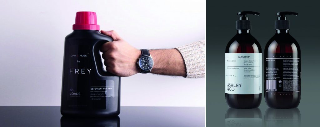 Other household beauty brands taking their cues from the contemporary monochrome beauty aesthetic include Ashley & Co (offering everything from lip balm to hair care via fabric cleansing) and FREY’s men’s grooming-styled fabric care range exhorting you to: “Smell good. Live remarkably.”