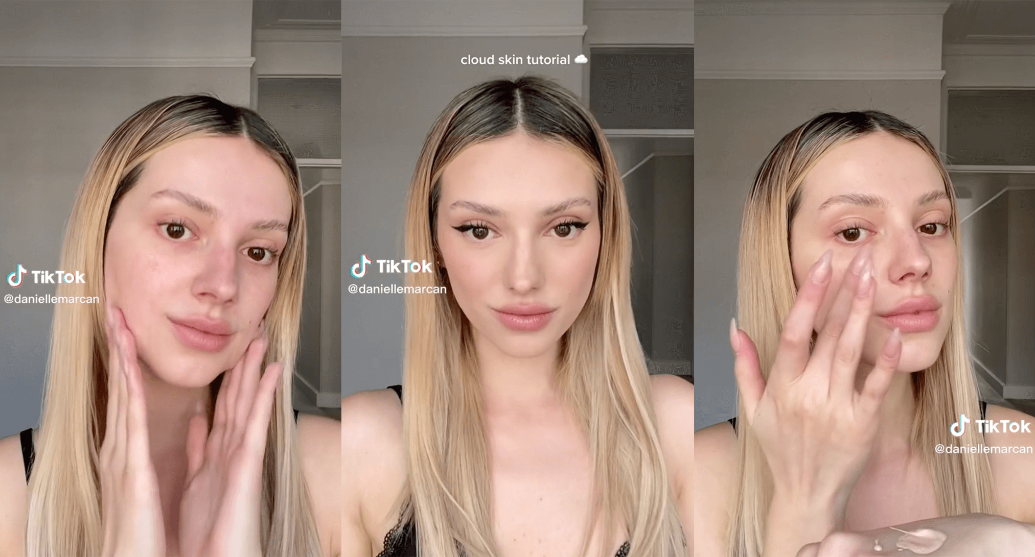 An easily achievable trend, cloud skin is simply the process of ensuring the face is hydrated before applying matte foundation. The outcome―a soft, perfectly matte finish―resembles a cloud—light, and fluffy. The process to achieving the look is even more simplistic, yet has still warranted endless tutorials on the app, instructing viewers to apply a hydrating moisturizer followed by a dewy primer and, finally, their matte face products. The trend rose to popularity after TikTok creators began praising the makeup of models Kendall Jenner and Hailey Bieber, who have been seen wearing the makeup technique lately. This popular way of applying makeup has led to multiple influencers teaming up with cosmetics brands for sponsored content. For example, @danillemarcan's partnership tutorial video using Clinique's Even Better Clinical Serum Foundation. The video received over 913K views within its first week of being uploaded.