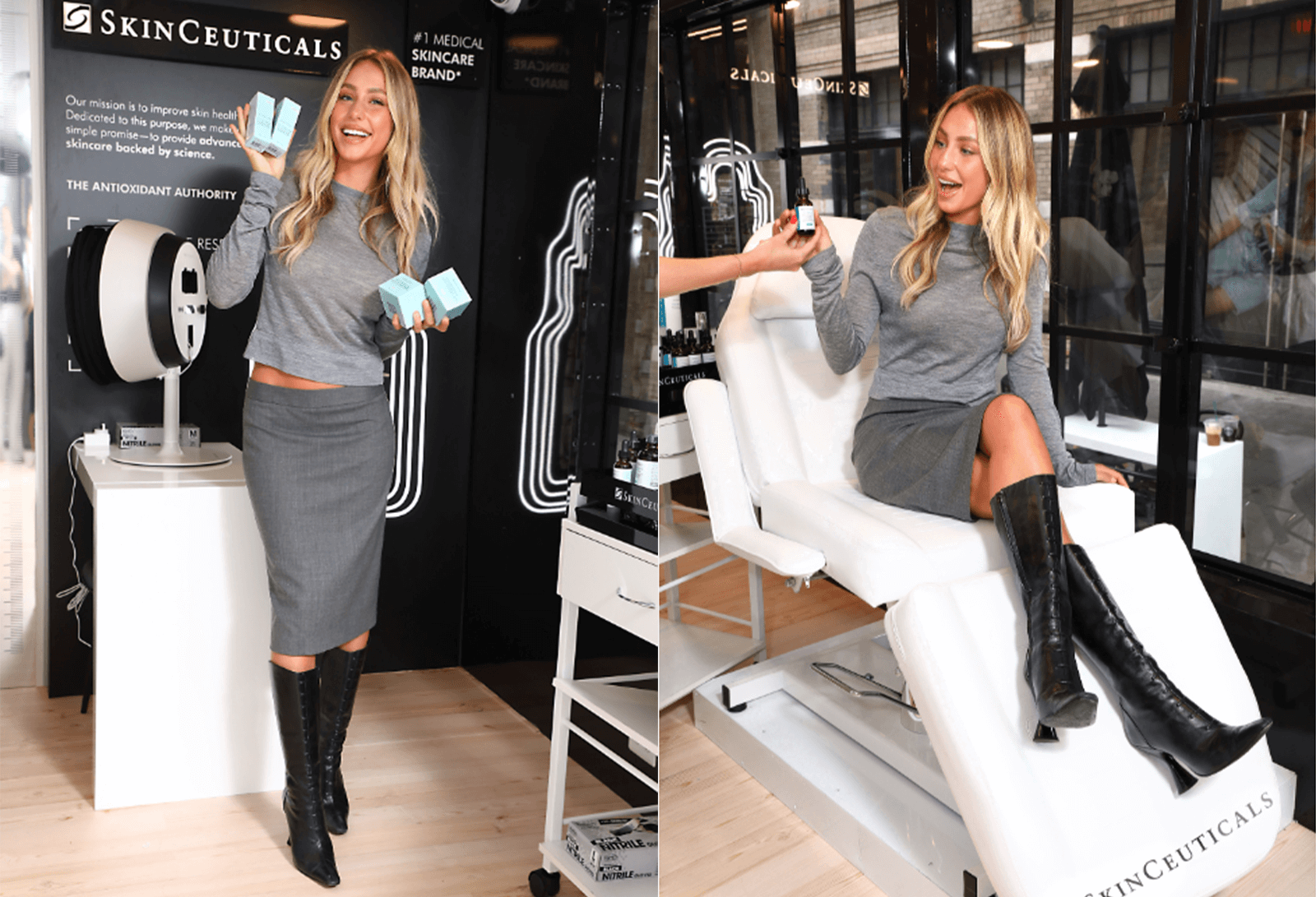 Each visitor received $50 worth of treatment credit for any SkinCeuticals SkinLab or flagship location, along with a sample of the best-selling C E Ferulic and a goody bag containing a skincare headband and branded water bottle. Expert one-to-ones were available, using the brand's detailed SkinScope analysis device, that enabled consumers to explore products, discuss specific skin concerns, and receive advice on the best way to combat these issues. Complimentary treatments were available, including facial peels and hand peels. A spin-to-win wheel outside the shop entrance allowed visitors to win extra treatment benefits including 20 units of Botox, red light treatments, and more.