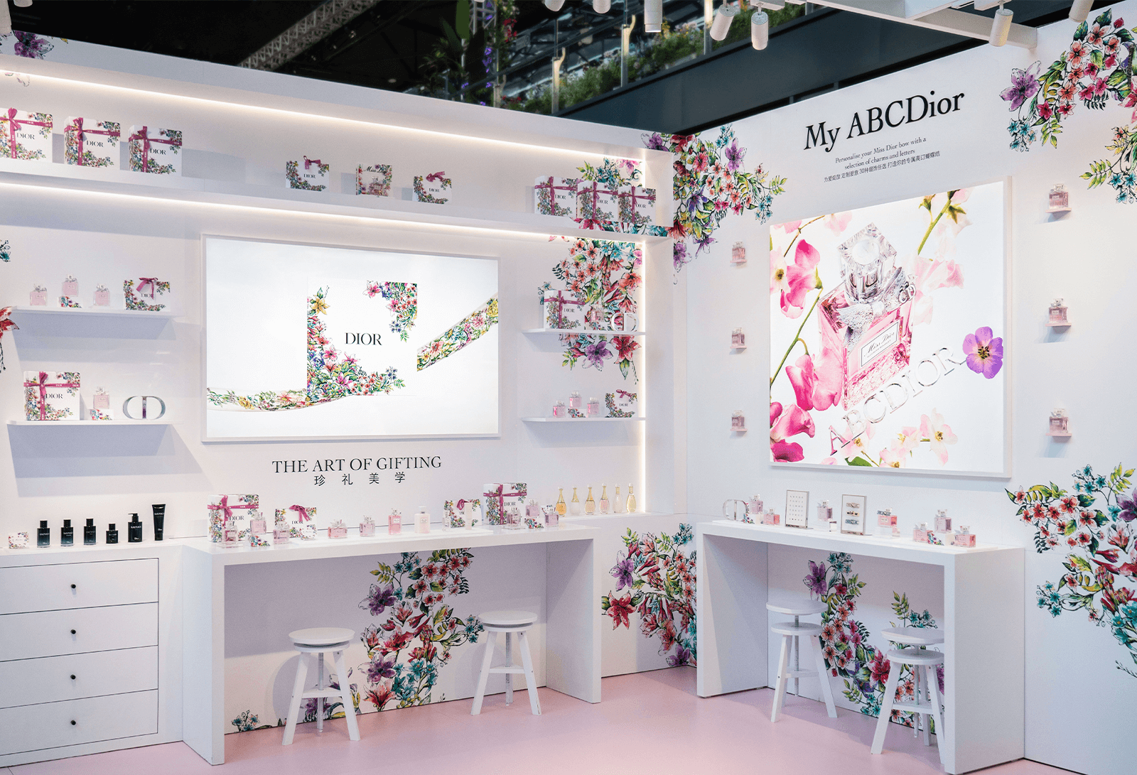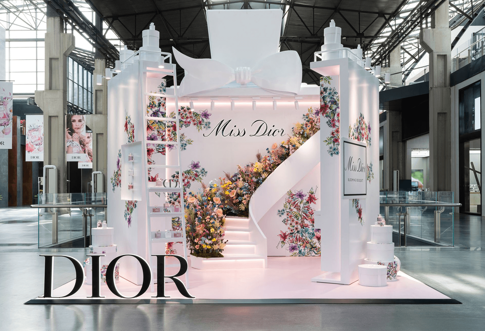 Dior: The luxury brand hosted the Miss Dior Blooming Bouquet pop-up in Xicheng Hongchang, Harbin, China, from April 15 to May 20. The visually led experience began outside the shopping center, which was decorated to replicate a giant Miss Dior bottle. Inside the shopping center, the pop-up took the shape of an opened perfume bottle, cut down the middle to reveal products inside. The space was heavily decorated with spring florals, with a staircase full of pastel blue, pink, and yellow blossoms. The walls were decorated with English and Chinese writing, reading phrases including "Love Is a Bouquet," "The Art of Gifting" by a gift-wrapping station, and "My ABC Dior" at a personalization station where customers could get their names engraved onto a product bottle.