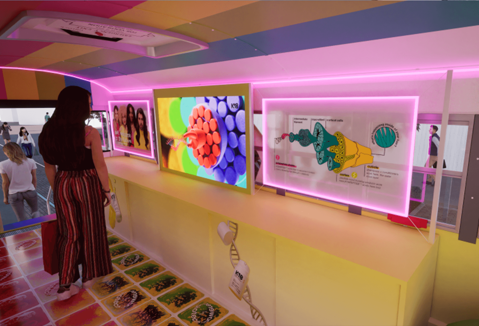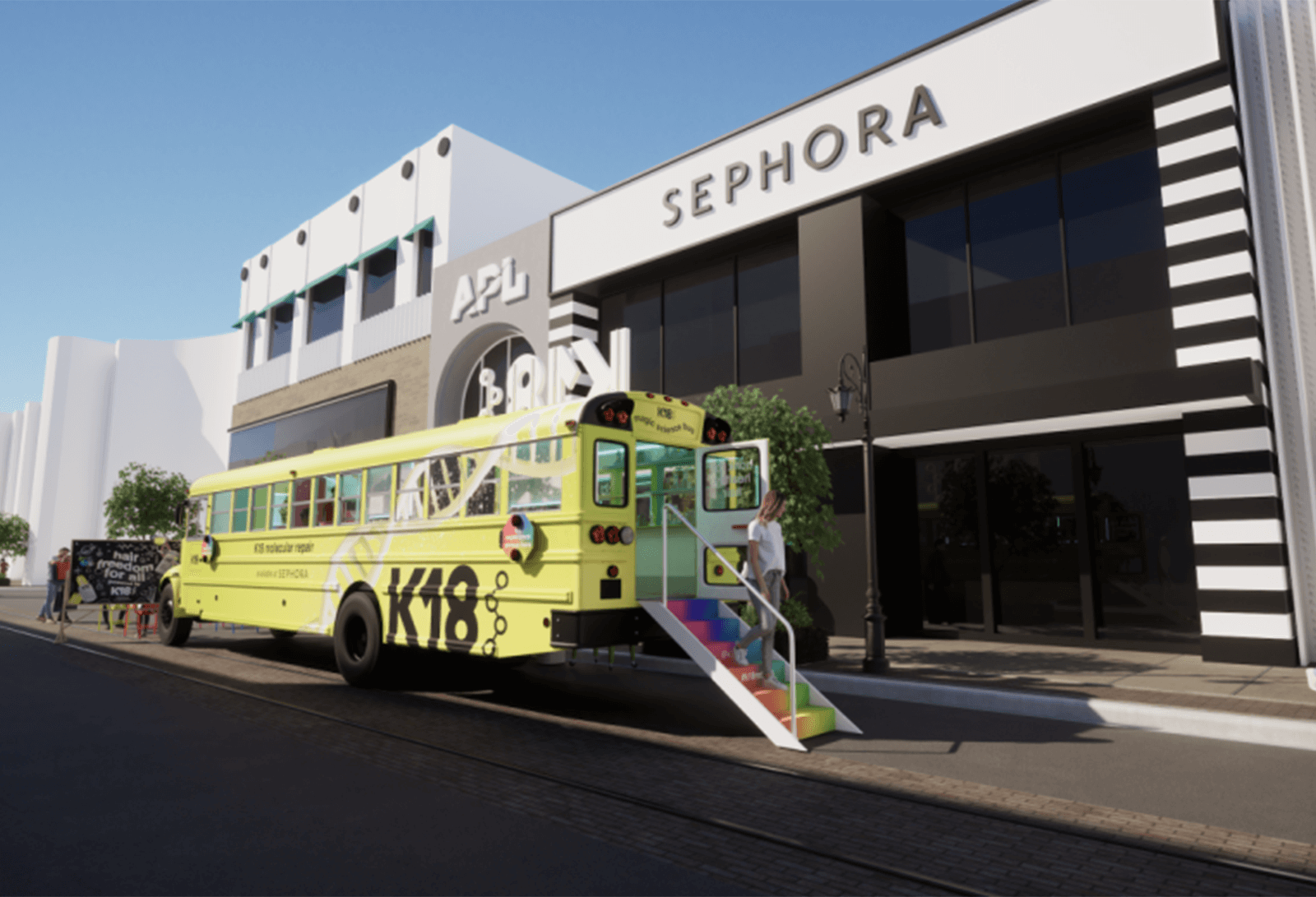 K18: The haircare brand popped-up at The Grove, Los Angeles to present a pop-up VR activation hybrid in celebration of its latest launch, the Molecular Repair Hair Oil. The temporary shop was presented in the form of a "science bus", a bright yellow vehicle resembling a school bus, with blackboards and other school-like elements decorating the space. The pop-up was placed outside Sephora, where its products are best-sellers. The VR experience took those participating into a virtual main room featuring videos of hairstylists explaining K18's ingredient technology and how it works. There was also an alternative room, specifically dedicated to the brand's hair oil launch, explaining how the SKU works to leave consumers with scientifically-backed hydrating results. For the non-virtual elements of the bus, infographics were displayed, explaining hair technology and how the hair reacts to the brand's products. The pop-up was created off the back of the brand's viral TikTok success, hoping to connect with loyal consumers in real life, and share the scientific building blocks of K18 in an educational and enjoyable way. The event was free for all to attend, with TikTok promotions featuring scannable codes for entry. Goody bags with K18 products were available to those who visited, as well as on site refreshments and snacks.