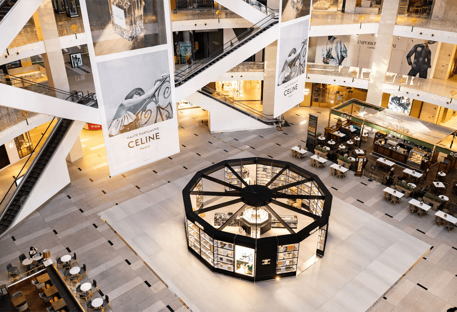 Celine: The Parisian brand traveled to Malaysia for its most recent pop-up installation. Taking place in the center court of Pavilion Kuala Lumpur, the retail experience ran from April 30 to May 15 and sold a range of products, from handbags to candles, with a significant focus on beauty. The temporary shop was shaped in a decagon feature, heavily decorated with marble, black, and gold trimmings, resembling the Art Deco era. In the middle of the shop stood a pyramid structure of perfumes, including statement fragrances such as Parade, Saint-Germain-Des-Prés, and Dan Paris; exclusive scents were also available, especially for the pop-up. In areas of the mall where the pop-up could not be seen, large advertisements featuring editorial images of Celine fragrances hung from the ceiling, guiding consumers to the main event.