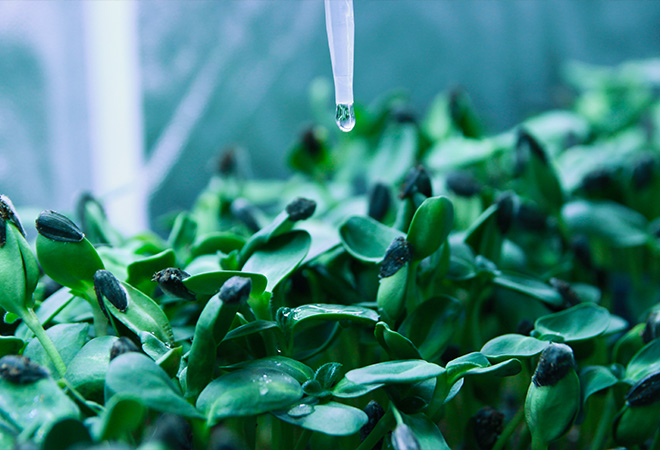 Our indoor vertical farm represents 6,500 square feet out of our 126,000-square-foot facility, hosting seven fully independent cells regarding climate control, lighting, and fertigation. We use precision indoor farming to control the plant's environment to optimize the production of interesting active molecules. Thus we grow and extract sustainable and substantiated actives. As we are not dependent on climate, seasons, nor soil, we can grow plants rapidly. As an example, our first active ingredients are extracted from microgreens, which require only 10 to 15 days of growth and a few extra days for extraction. Harvested and extracted immediately after, the freshness of the plants is preserved as well as their content in active molecules.