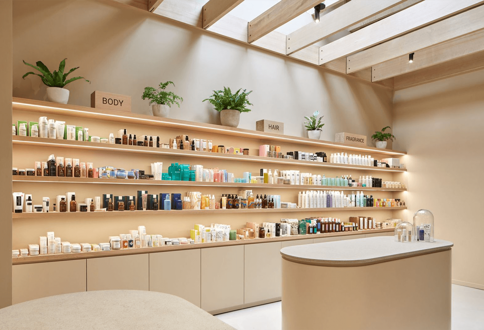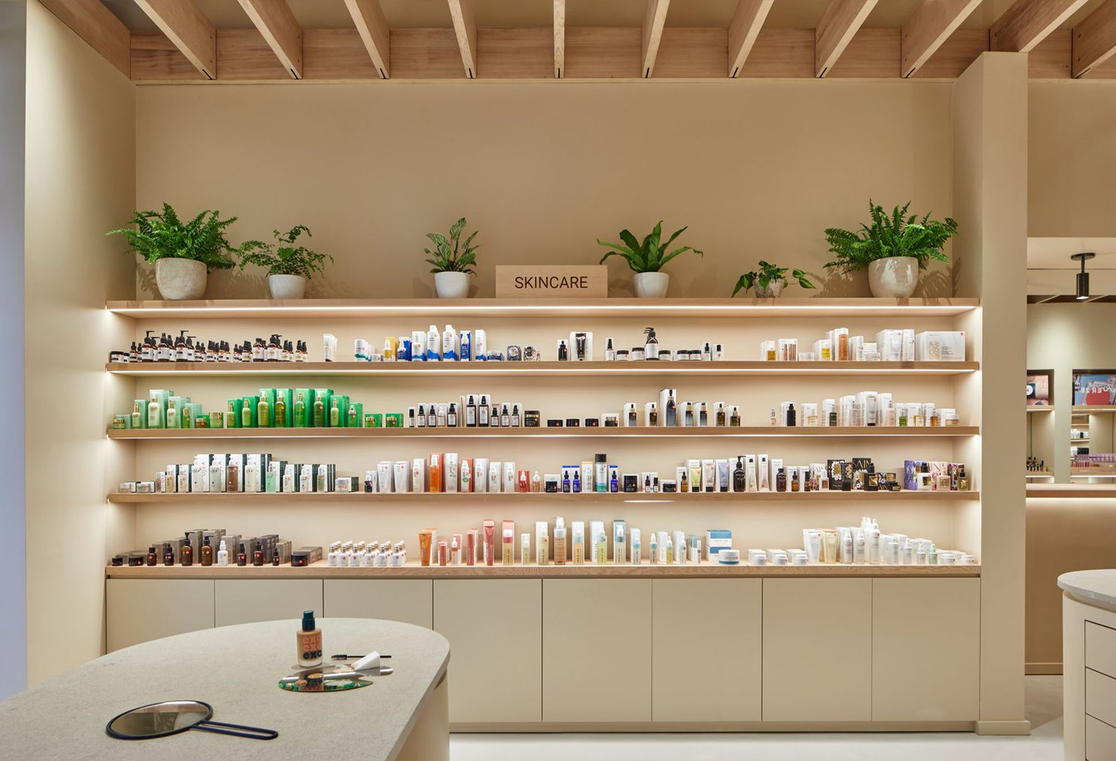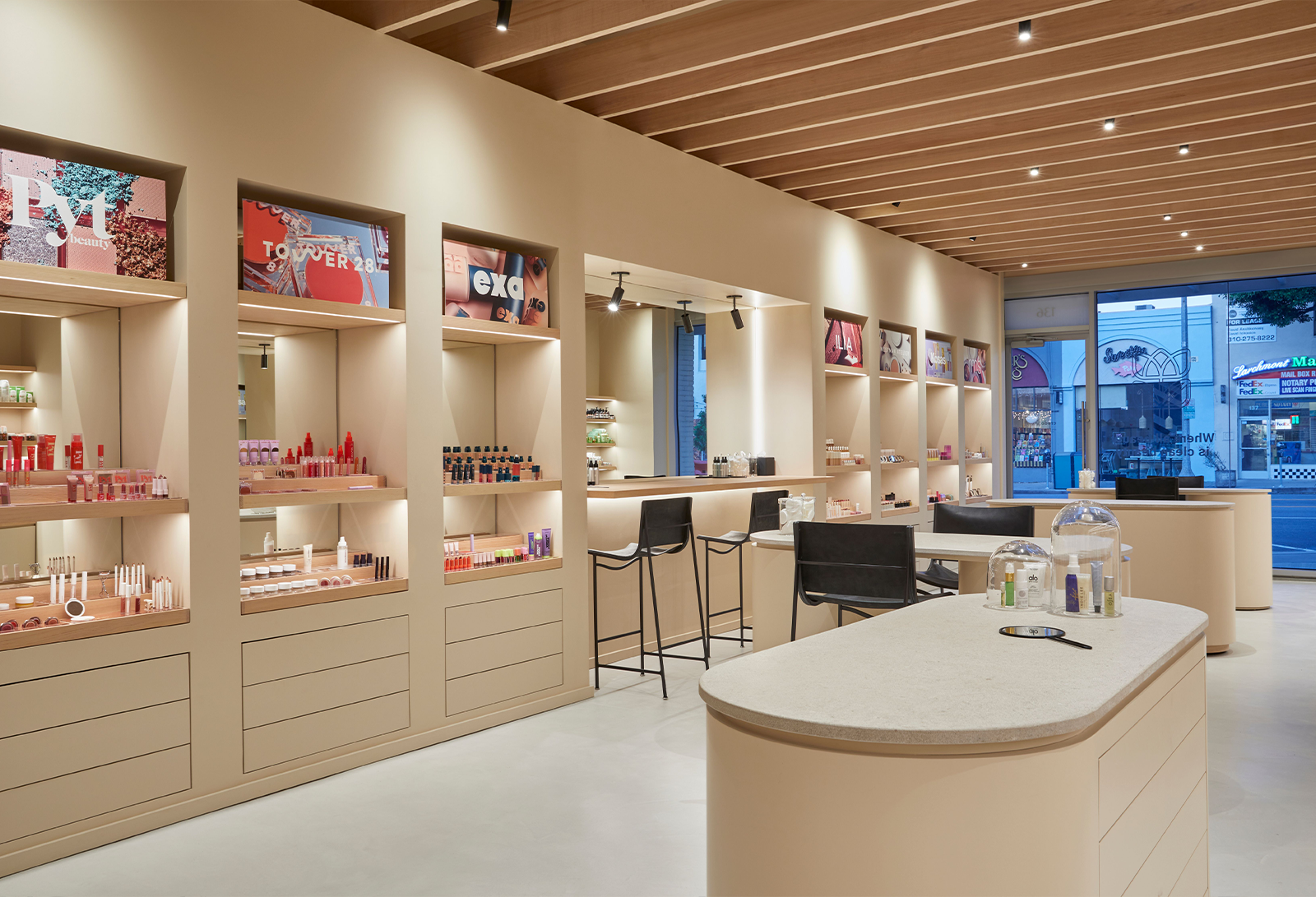 "Natural materials including hand-oiled, domestically sourced, Hemlock and Douglas Fir wood are used throughout the store to permeate a sense of warmth, creating a calm backdrop that invites the customers to shop Credo’s select clean beauty brands," Maša Kleinhample shared. "Soft warm beige plaster walls hug the domestic Hemlock installed as a beam ceiling and, together with the textured limestone on millwork surfaces and polished concrete floors, give an unpretentious domestic feel to the interior, providing a backdrop for Credo’s clean mission.”