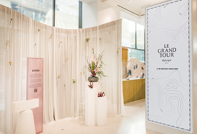 The installation first leads visitors into the Paris room, filled with illustrations from the Maison archive, with a special focus on the antiquarian bookstores, paid homage to in the brand’s Paris candle (a chypre fragrance with lavender notes). Following on is the Venice space, exploring the scents of the city’s lagunas which inspired the Venise eau de toilette, a basil, green pepper, and mandarin concoction. The fragrance is released into the room via the foam covering of a mirrored steles sculpture. Next up is the Greek village of Milies, represented through a range of traditionally colored white, blue, and ochre ceramics, plus the company’s signature oval ceramics diffusing the scent of fig trees, immortelle bushes, and maquis shrubs. The Lebanese city of Byblos, brought to life in olfactory form via notes of cardamom, coffee, and cedar, builds the basis of the next space, accompanied by baskets of overflowing grains and an overhead build made of thick natural cords. The final installation celebrates ikebana, the Japanese art of flower arrangement,, coinciding with Diptyque’s Kyoto eau de toilette, comprised of three dominating scents: The rose for the people, incense for the heavens, and vetiver for the earth.”