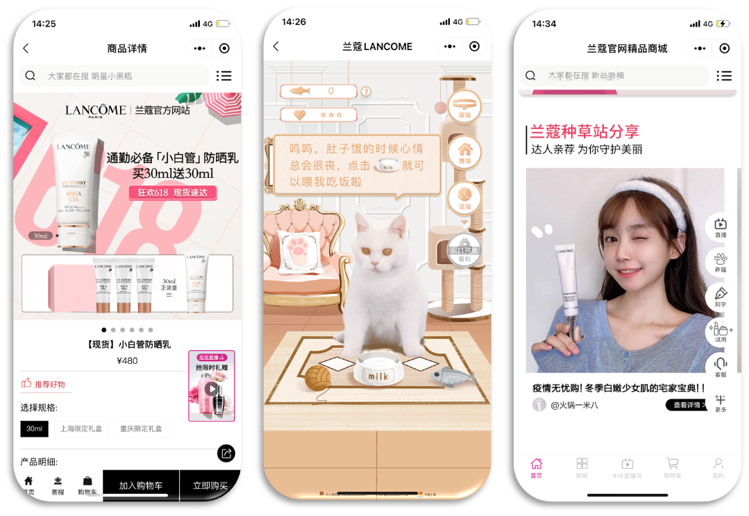 Lancôme leverages WeChat Moments Ads to reach potential customers, who then land at the mini-program campaign page to sign up for the program and adopt a virtual cat after making their first order. Customers will need to earn virtual cat food by logging in daily, sharing with friends, and purchasing products. Encouraging such frequent interaction embeds the brand into consumers’ daily habits.