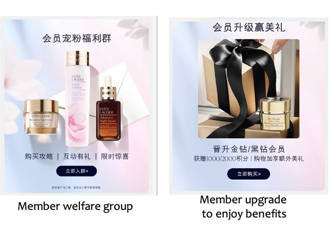 Combined with WeChat, Estée Lauder launches member welfare groups towards its registered members with special incentives. Within the group chat, members receive extra benefits like exclusive rewards, product purchase tips, and limited-time gifts with purchase. This attracts high-value customers and increases their loyalty towards the brand.