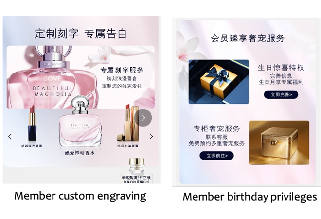 Building a membership tier that offers high perceived value and elevates the customer experience are also part of the SCRM strategies of Estée Lauder. The brand divides membership into four tiers, from entry level to the highest tier. Each has its own color system: pink diamond, blue diamond, gold diamond, and black diamond. Each tier has its own points limit and qualifications and comes with a unique offer that matches the value of the membership.