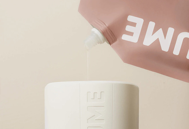 Currently, Paume uses 65-75% PCR in the brand’s smaller packaging materials, like bottles, pumps, and tubes. The brand sells refillable bags of its hand sanitizer, which uses 60% less plastic than a bottle. This minimizes the number of new bottles that the brand makes, which is great from a sustainability angle, but also great from a supply chain and economic perspective. The refill bags are less expensive to make, hold more product, and last longer.
