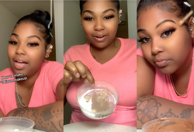 Jail Makeup: According to TikTok, prison inmates like to look their best too. However, due to strict rules on what can and cannot be taken or sent into prisons, many are left to experiment with whatever they can find to achieve their desired beauty looks. A video by @taylorbnice brought the trend to light, and gained 10.8MM views and 1.2MM likes  just four days after being uploaded. In the clip, the content creator gives a tutorial on how she did her makeup during the 17 years she served in prison. The video begins with baking flour in a bowl, followed by a Pepsi, and half a packet of cocoa mix whipped together to create a foundation-like texture. The creator then swatches the substance onto her arm, revealing extremely high coverage that entirely masks any blemishes and even a tattoo. The common “TikTok made me try it” phenomenon has taken over with this trend, as several beauty influencers and everyday consumers have begun to try out the DIY hack for themselves. @Mirayarios followed the steps presented by Taylor, adding extra flour to adjust the shade of makeup to her skin tone, with this rendition of the trend receiving 625K views and 22.5K likes. User comments have suggested other popular ingredients—including baby powder and coffee grounds—that can be used to achieve similar looks in prison.