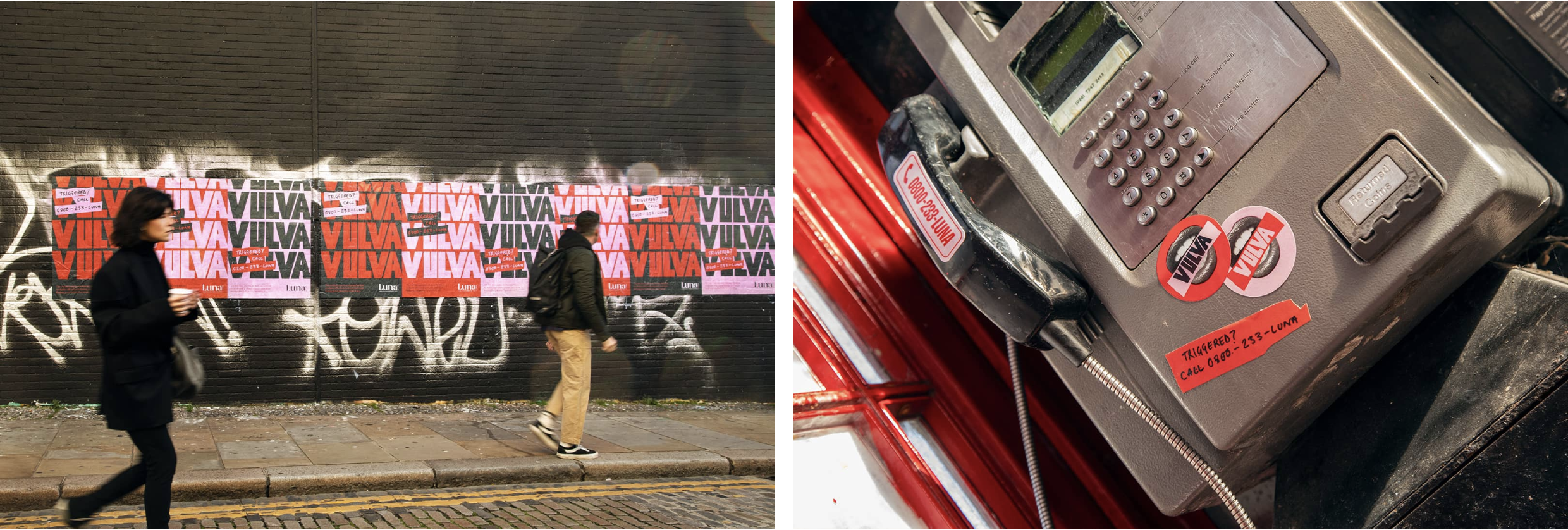 Joan London created several out-of-home (OOH) displays to promote the hotline, all featuring a bold typeface that puts the word "vulva" front and center on billboards, posters, and stickers on street lamps. The campaigns are set to run for two weeks, with large takeovers on buildings including London’s Tate Modern.