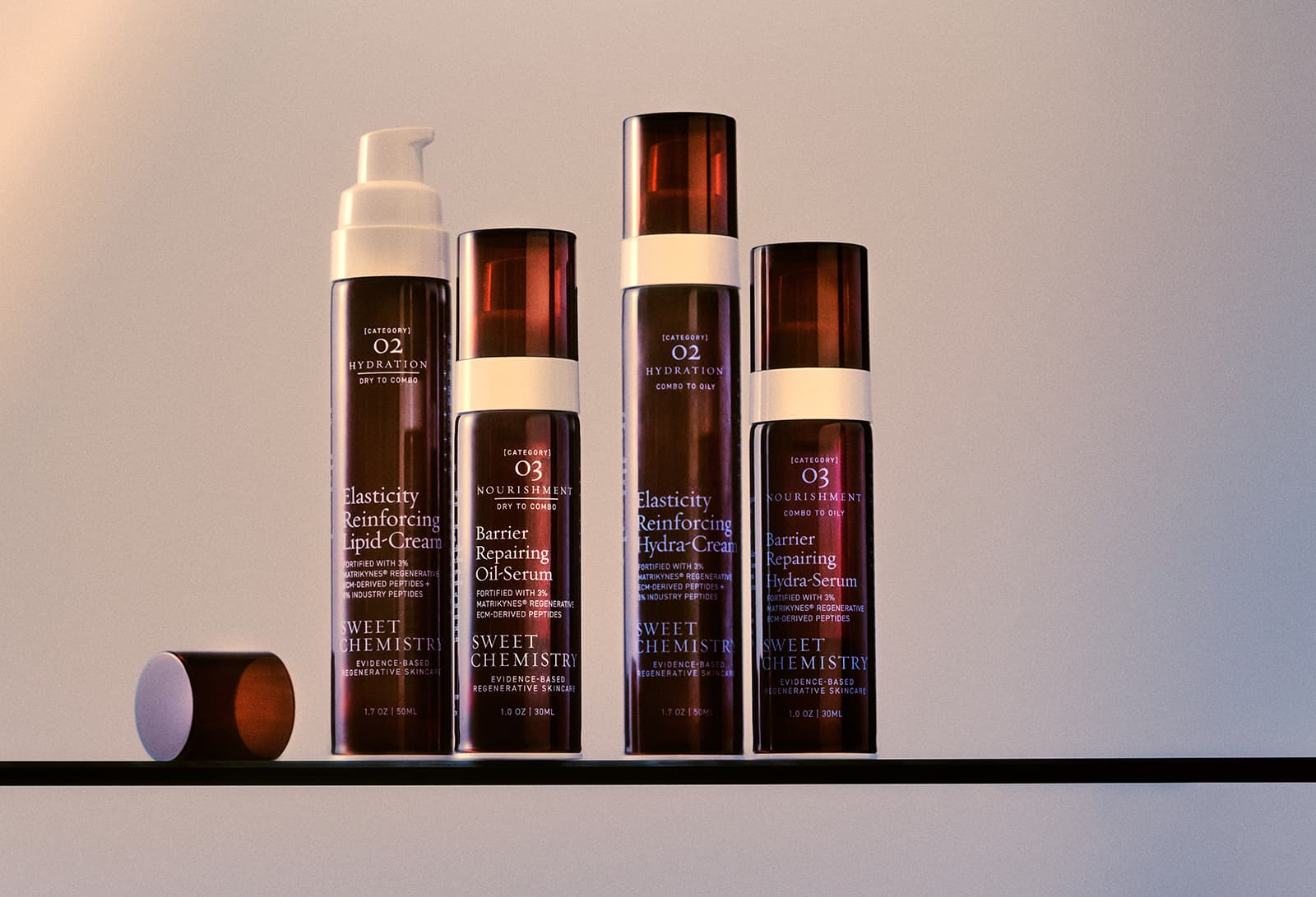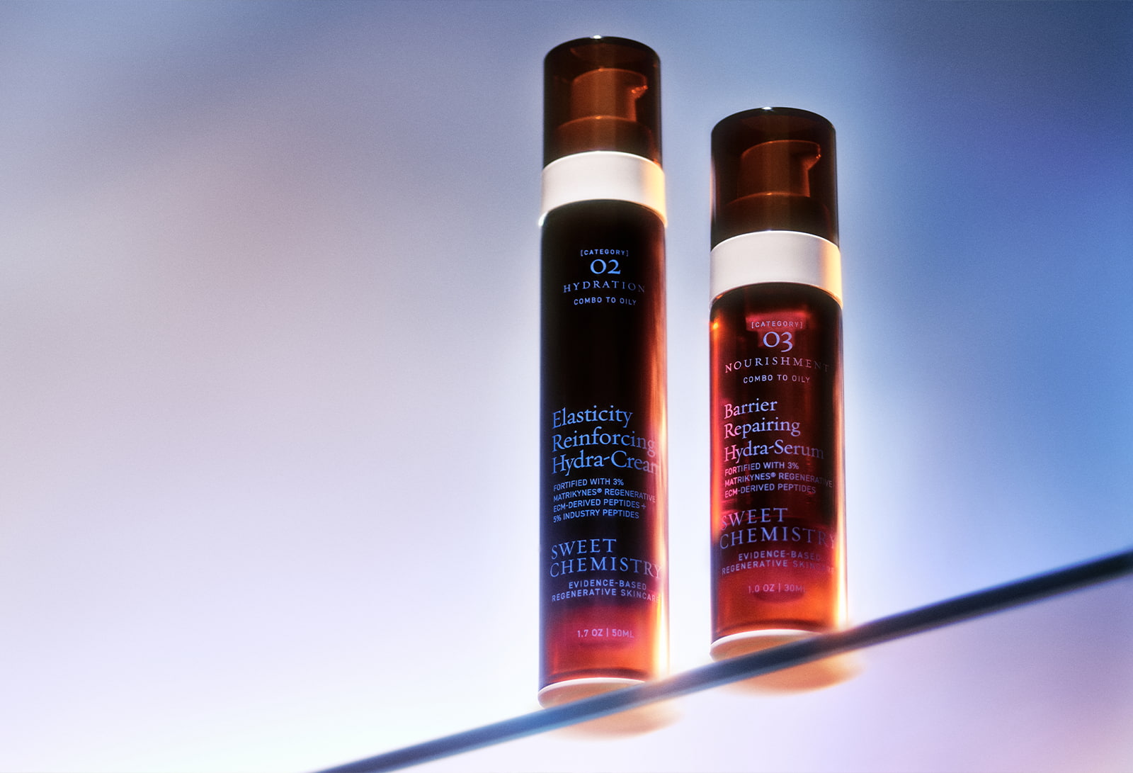 Every few decades, a significant advancement moves the skincare industry forward. Created by chemist and innovator Alec Batis and bioengineer Dr. John O’Neill, PhD, Sweet Chemistry was built on decades of life-changing biomedical research and uncompromising cosmetic science. Sweet Chemistry is evidence-based bioactive skincare that repairs and regenerates the skin by utilizing the latest innovation in tissue engineering and organ repair known as Matrikynes—a patent-pending polypeptide concentrate extracted from a natural extracellular matrix of upcycled zero-waste bovine bone. These advanced polypeptides are enveloped within proprietary formulations that incorporate dermatological and pesticide-free botanical actives at clinically tested functional levels—all housed in the first piston-on-glass airless bottle that uses 87% less plastic than traditional bottles.
