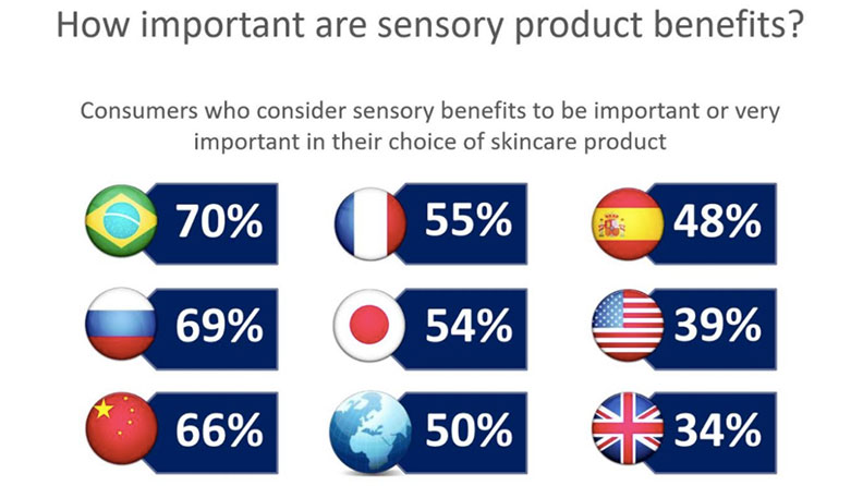 Datamonitor also looked at the importance of sensory product benefits in the choice of skincare products across various countries, and the below illustrates this: