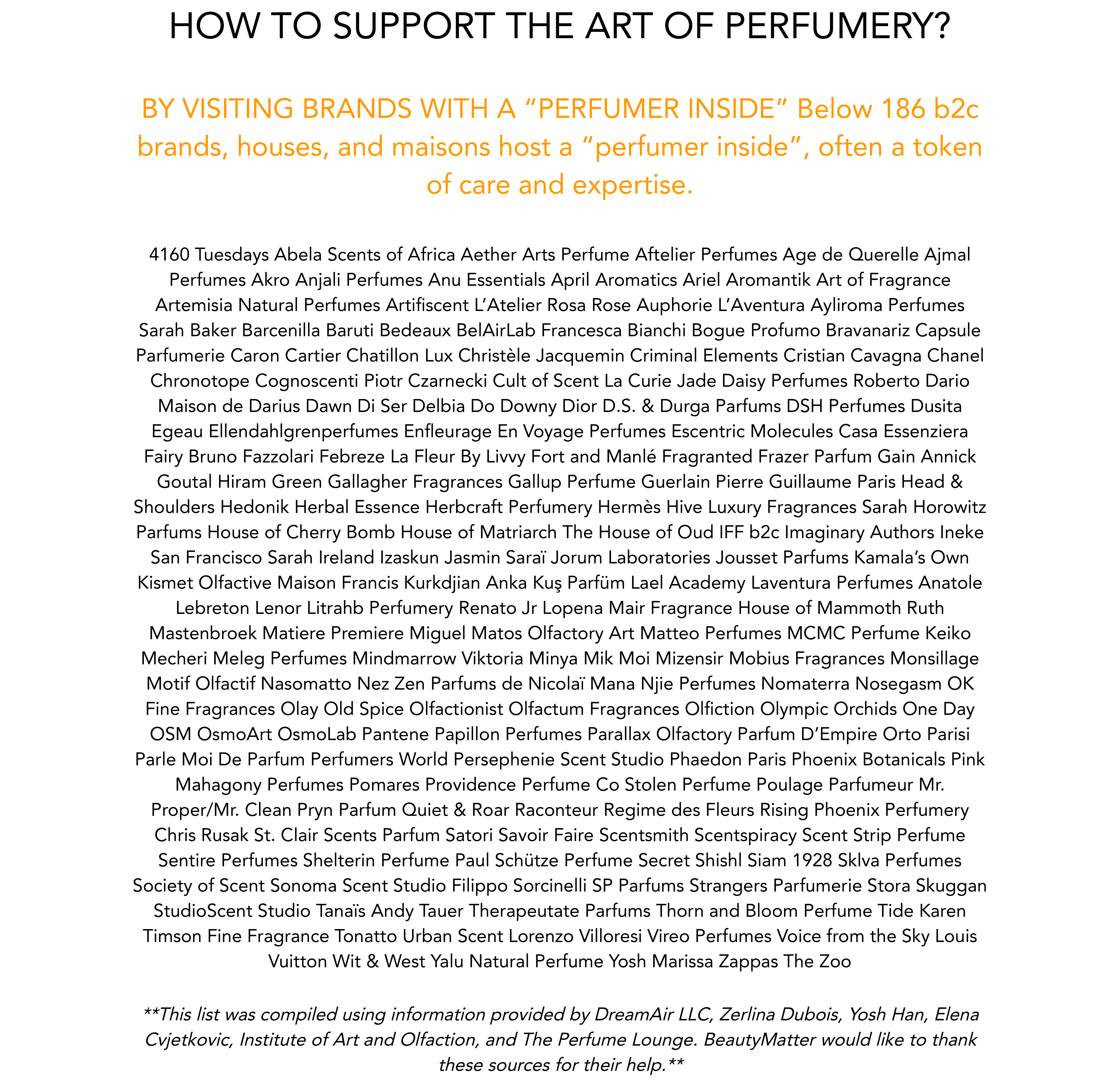 Ask for a company’s diversity and ethical statement, as well as checkpoints they have put in place to improve their situation. You will see at some brands that the teams have not changed a bit since June 2020. You will see that the Fragrance Foundation New York and RIFM (Research Institute for Fragrance Materials) have not changed at all.