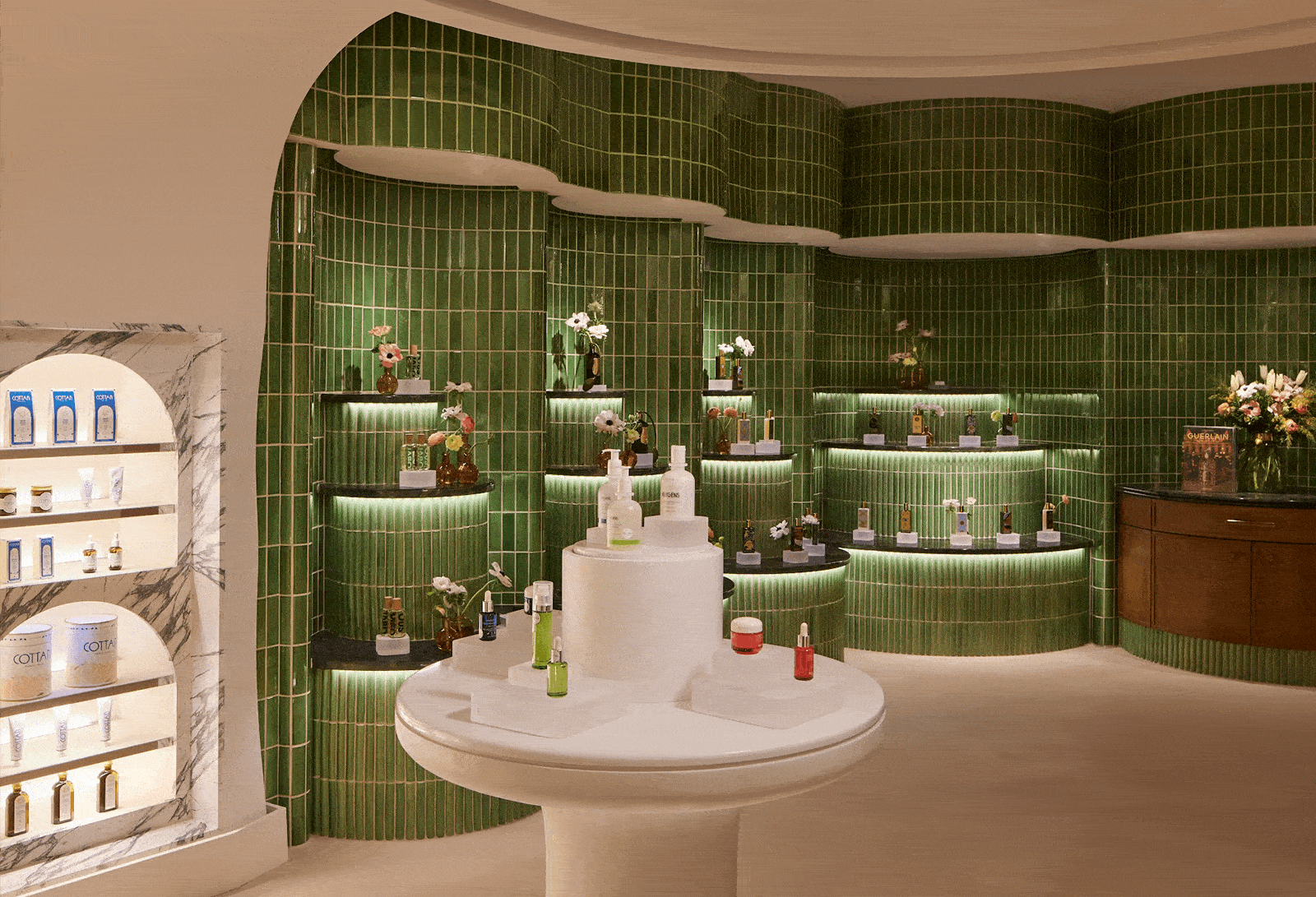 Its Beauty Corridor features verdant-tiled displays leading into swooping cream concrete corridors with resin fixtures. The path leads to the color cosmetics department and spa space, the Salle de Bain, where visitors can receive Guerlain treatments. A notable feature of the space is that there are no branded beauty counters or staff—all sales associates are Printemps employees. Rather than having a sole brand focus, these in-store advisors are trained experts enabling cross-brand discovery for the customer. The Beauty Corridor presents a more fluid and retailer-controlled (rather than brand) model of beauty retail, opening up an equal channel of exploration and discovery.