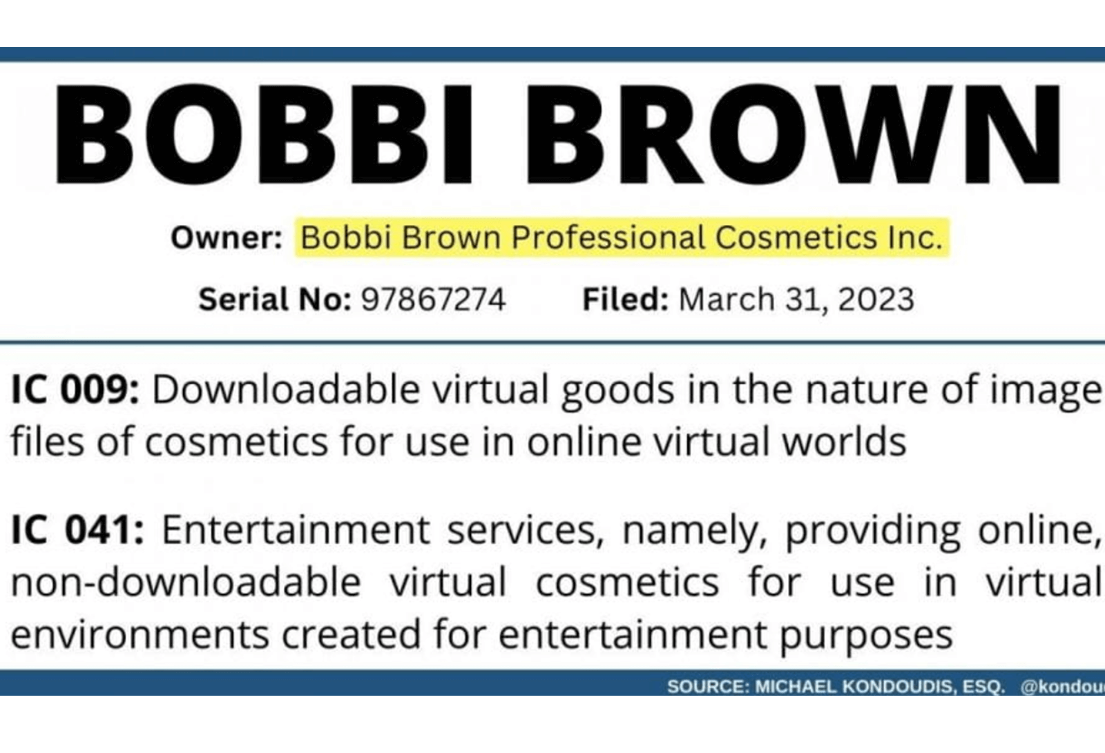 Bobbi Brown: The British beauty brand has filed two trademarks for the metaverse. Filed with the United States Patent and Trademark Office, the applications are IC 009: "Downloadable virtual goods associated with images of cosmetic products for use in virtual worlds," and IC 041: "Entertainment services, namely providing virtual cosmetics for entertainment purposes in virtual environments." The trademark applications are the same as those made by Ulta, Maybelline, and Sephora last year; Maybelline's application led to the brand's metaverse launch on Tmall and virtual ambassador, May. Bobbi Brown's applications have been made under "intent to use," meaning the company is expected to develop products for the metaverse shortly as opposed to filing for a trademark to protect the brand's name in the virtual space.