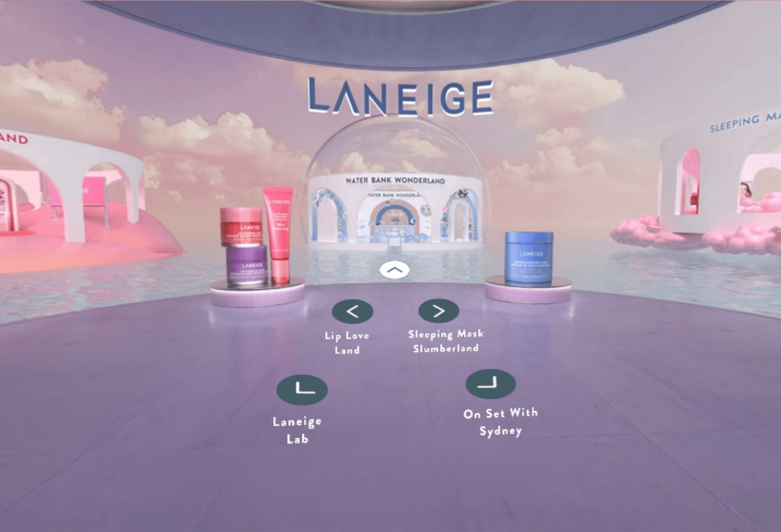 Laneige: The K-Beauty brand has debuted its first metaverse activation in the form of a virtual store. When entering, customers are placed into a lobby in the clouds, which divides into five different rooms, each designated to a product: Waterbank Wonderland, Sleeping Mask Slumberland, On Set With Sydney, Lip Love Land, and Laneige Lab. In each room, visitors are given the opportunity to learn more about the ingredients within the brand's skincare products through gamification, animations, and videos. In the On Set With Sydney room, consumers are given access to exclusive videos and photos of actor and Laneige spokesperson Sydney Sweeney. Those visiting the virtual world can also participate in a scavenger hunt for the chance to win two free products alongside a physical product purchase. Skincare quizzes are also offered, giving product recommendations to consumers based on their skin type. The metaverse store was created in celebration of the brand's newest collection, the Water Bank Blue Hyaluronic Collection, with these products advertised throughout the online space.
