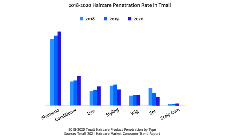 Penetration rates of haircare, scalp care, dye, and perm are also growing stably. Conditioner growth in 2020 is even higher than shampoo, the Tmall Haircare Market Consumer Trend Report highlights. As diverse needs increase, customers will spend more on scalp care. This is a tremendous category opportunity.