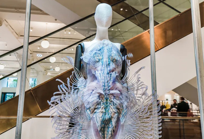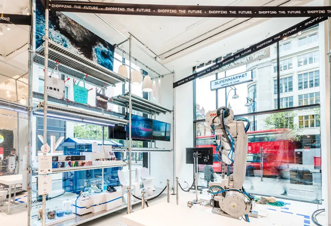 For this project, collaborators include Parley for the Oceans, which showcases a 2.3-meter-tall ABB IRB 5700 robot that converts plastic pollution into homeware, clothing, and sunglasses; Iris Van Herpen’s couture creations made of recycled ocean plastic; Air Company’s CO2-powered fragrance (a UK exclusive); and a mushroom bar courtesy of nootropics-infused brand DIRTEA.
