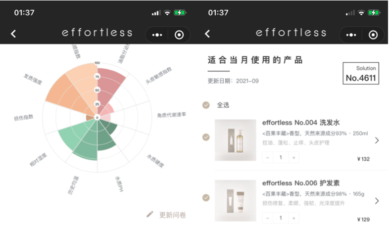 Effortless’ personalization algorithm and data collection rely on WeChat mini programs as it is much more convenient for users to take the quiz on an app that they already use every day and share the links to others. Then Effortless launched a Tmall store to sell normal ready-made haircare products. The company still encourages consumers to follow its WeChat account and take the quiz if they are not sure about which products to use.