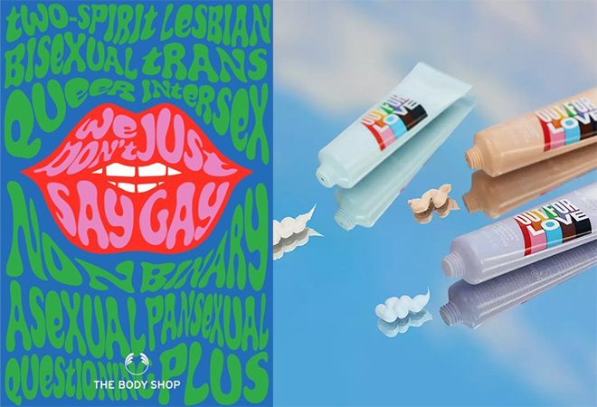 In response, the activist beauty retailer is launching a pro-2SLGBTQ+ creative campaign that directly opposes this legislation. The 2022 Pride campaign will be brought to life through retail signage, digital initiatives, an educational hub, nonprofit partnerships, and dedicated product sales. Visitors to the brand's North American stores will see bold, colorful signage, videos, and specially designed apparel worn by retail staff including bandanas and pins that will read "We don't just say gay. We also say…" followed by the list of 2SLGBTQ+ identifiers, including "pansexual," "bisexual," and "trans," among others, meant to capture the sentiment "we say it all" for, and in solidarity with, the 2SLGBTQ+ community. The Body Shop will also be putting up outdoor advertising in key locations on building walls, outside cafés, and in other high-traffic areas in city centers, calling for the passing of the Equality Act.