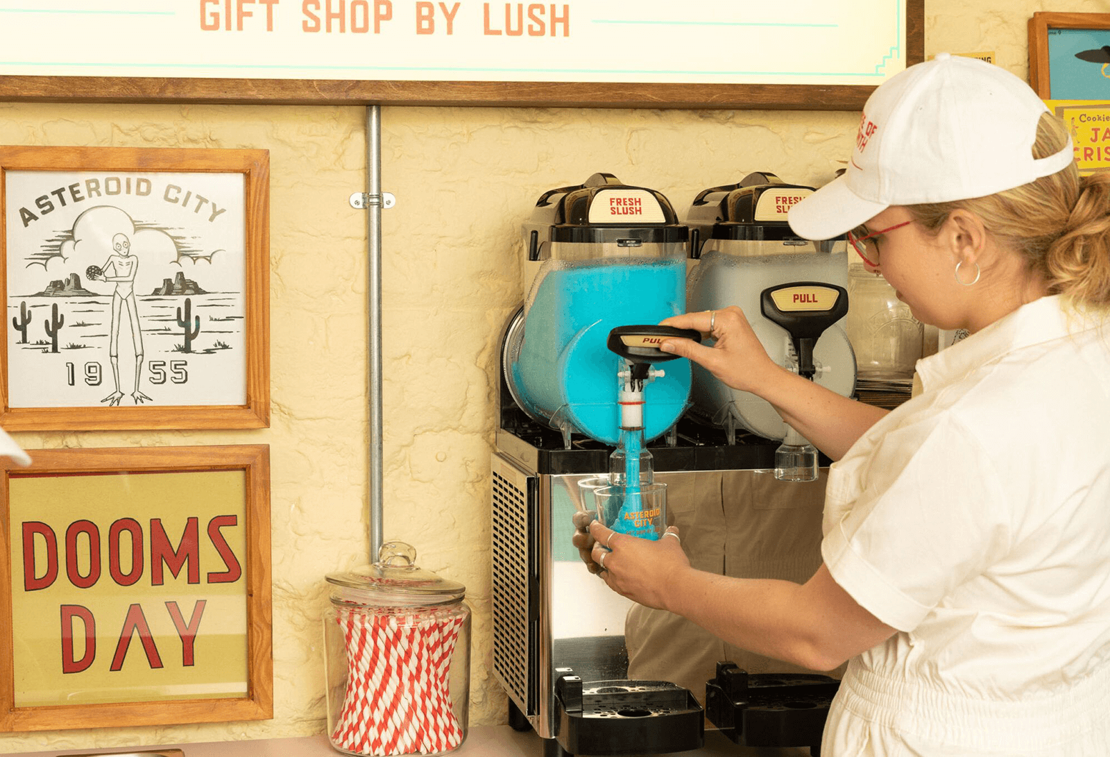 Alongside the collection, Lush created a pop-up gift shop in London's Soho neighborhood, decorated to replicate scenes of the film's "retro-futuristic" set. The pop-up takes the form of a rustic cafe, reminiscent of 1950s American diners, in a desert setting with bright yellow and blue walls, patchwork purple flooring, and potted cacti. When visiting the space, consumers are offered the chance to engage with Lush experts about the new products and receive free slushies decorated with bold colors and dazzling sprinkles, all while getting involved in photo opportunities.