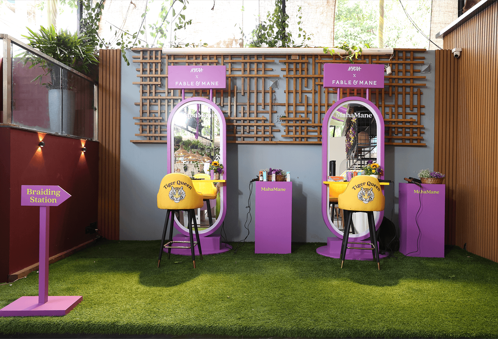 Fable & Mane: To celebrate the launch of MahaMane at Indian shopping destination Nykaa, Fable & Mane took a trip to India to present MahaMela, dubbed the South Asian Coachella by CEO and co-founder Akash Mehta. The event occurred in a sizeable circus-like tent with an alternating purple and yellow color scheme, decorated with shelving units that held best-selling products, and bright, bold, indian-print inspired lamps and bunting. Around the tent, visitors were able to interact with the brand at several different stations, from classic carnival games offering a chance to win exclusive prizes to candy floss stations and photo booths. The event also featured a hair braiding station where those in attendance could have their hair styled using Fable & Mane products, finished with vibrant flowers dotted throughout the braids.