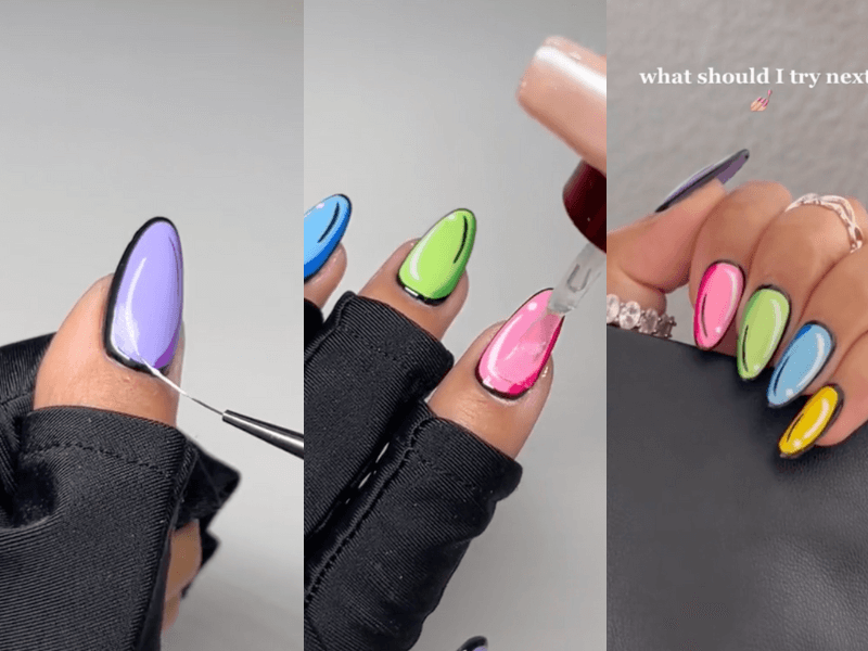 Pop-Art Nails: Since rising to popularity on TikTok at the latter end of 2022, #popartnails has gained an astounding 72.4 million views. A video posted by nail content creator @michellekhxn that instructs followers on how to achieve the cartoon-looking trend has gained over 38.8 million views and an impressive 5.5 million likes. In the video, Khan starts with a bright base color (varying for each nail) followed by a bold black outline around the edges of the nail, and a lighter streak of the selected color on the side that is finished with a white line on the parallel side to create an artificial, pop-art, shadow effect. Once complete, the full set of nails resembles an animated image. Despite the skill and precision of the video, in the comments several users recommended that Khan add a matte top coat for an even more cartoonish result, as shown in @alinahoyonailartist's video, which has over 99 thousand views.