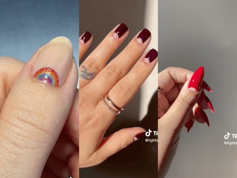 Half-Moon Nails: The term half-moon in reference to nails is usually associated as a nickname for the nails’ lunula (the lighter crescent-shaped part by the nail bed); however, recently, the term has adopted a new meaning. Several nail artists are showcasing their take on half-moon nails across social media―painting the entire nail and leaving the lunula unpainted, or decorating it in contrast, emphasizing a crescent moon shape. Originating from 1950s Hollywood glamour, the nail trend is regaining popularity with its new name because it is extremely versatile. Some are going for a more neutral look while others go bright and bold. A handful have also opted to paint only the outline of the lunula, leaving the nails plain except for one small, curved line. The trend has gained a lot of traction on TikTok, with multiple users referencing Olivia Wilde's manicure in the film Don't Worry Darling and Taylor Swift's look in her Bejeweled music video—confirming that celebrity influence is still strong in the nail category. Standout TikTok creations underneath the hashtag include a rainbow half-moon manicure created by @polished_yogi, alongside @lightslacquer's look of an iridescent half-moon contrasted with a deep burgundy, which amassed 289 thousand views.