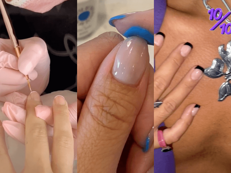 Micronails: A minimalistic trend embraced heavily by "clean girls," micro nails are the polar opposite of the long, coffin-shaped acrylic nails which were very popular in the 2010s. Featuring simple designs and natural shapes, micro nails often don't include extensions or added tips and are decorated in a low-maintenance fashion. Popular styles include clear polish, accompanied by a thin line of neutral color on the tip of the nail. The trend has been praised on TikTok for its level of ease, as well as the minimal time it takes to achieve the look—with several users claiming it takes no more than 10 minutes to perfect. Across the app, #microfrenchnails has over 1.3 billion views, with popular entries coming from trans/female-owned press-on nail brand @scandalbeauty whose video showcasing press-on mini manicures has over 64.7 thousand views. Due to the precision needed to create such a thin line along the top of the nail, several TikTokers have shared hacks to achieve the perfect line, with some recommending painting the back of the finger and pressing it onto the nail. At the same time, big nail brands, such as OPI, also celebrate the trend. These brands share their version of the micro manicure that uses a beauty blender as a guideline in the same way as the finger and finishes the look by pressing the polish onto the nail.