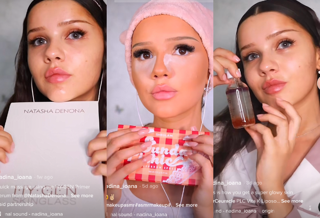 Known for both beauty and food ASMR content, Nadina Ioana is a Dubai-based ASMR guru. While most users focus on a broader spectrum of beauty within each video, Ioana focuses on one specific product or practice within her videos, varying each time. From lip care, freckle, eyebrow, and pimple reduction routines to manicures and hair washing, there is little the content creator has not covered during her time on TikTok. Within each video, users can experience the satisfaction of product application and the sounds of product packaging. Ioana explores various packaging types within her videos, from hard metal eyeshadow palettes to soft bubble face masks, providing her 11.3 million followers with a wide range of readily available content.