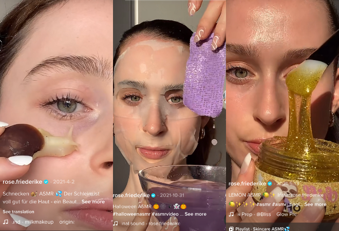 Experimenting with the more abnormal side of ASMR, Rose Friederike provides her 3.3 million viewers with surprises on their For You pages. Snail mucin added to products is nothing new on TikTok; however, Friederike uses real snails. Applying the snails to her cleansed face, the creator allows the creatures to move across her face, eventually removing them and spreading the mucin left behind across her cheeks. The sound of the snail is heightened by a microphone and left as the main audio for the video. Although unlike typical ASMR videos, the clip gained massive attention, receiving 30.4 million views and 2 million likes. Alongside skincare, the creator also experiments with makeup products and packaging. In a popular video, Friederike is seen biting into a lipstick, creating a loud crunching noise, with the caption “candy or makeup?” The fun doesn’t end there, with the creator also posting ASMR fails and bloopers, racking up 83.6 million views and 5.8 million likes.
