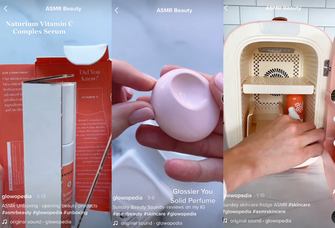 Focusing on unboxing, @glowopedia often shares new finds with her 295K followers, creating an array of sounds. From body butter and serums to the filling of beauty fridges and bags, the creator showcases the sounds of multiple elements of beauty. Unlike most videos, the TikToker begins the unboxing from as far back as the packaging the product arrived in, giving her followers the ultimate sound experience. Another popular addition to the ASMR-based account is videos such as “What I used in my shower.” Within these videos, users can not only find new products with honest reviews, but they can also continue their ASMR experience through the sounds of the shower water and product openings.